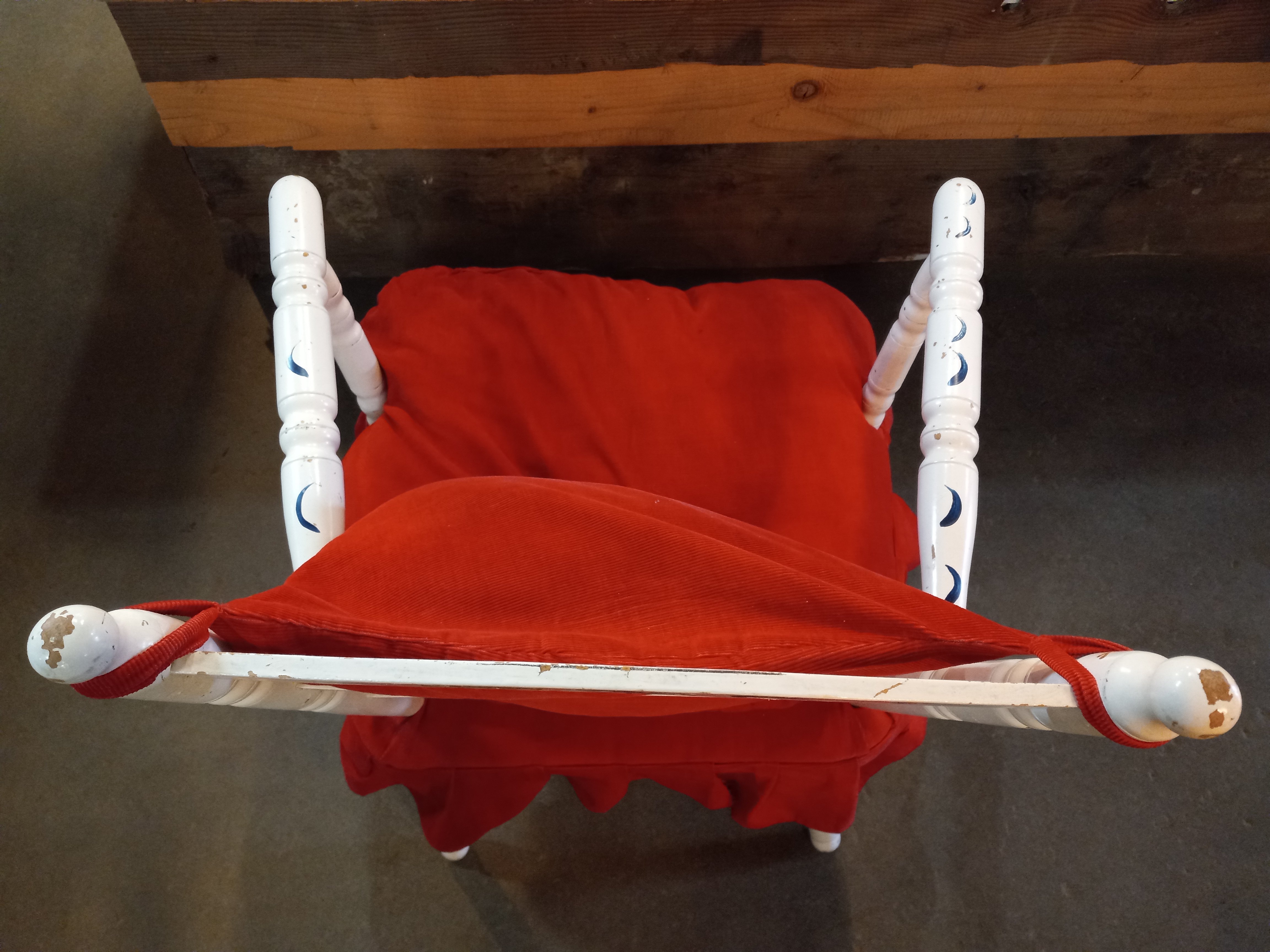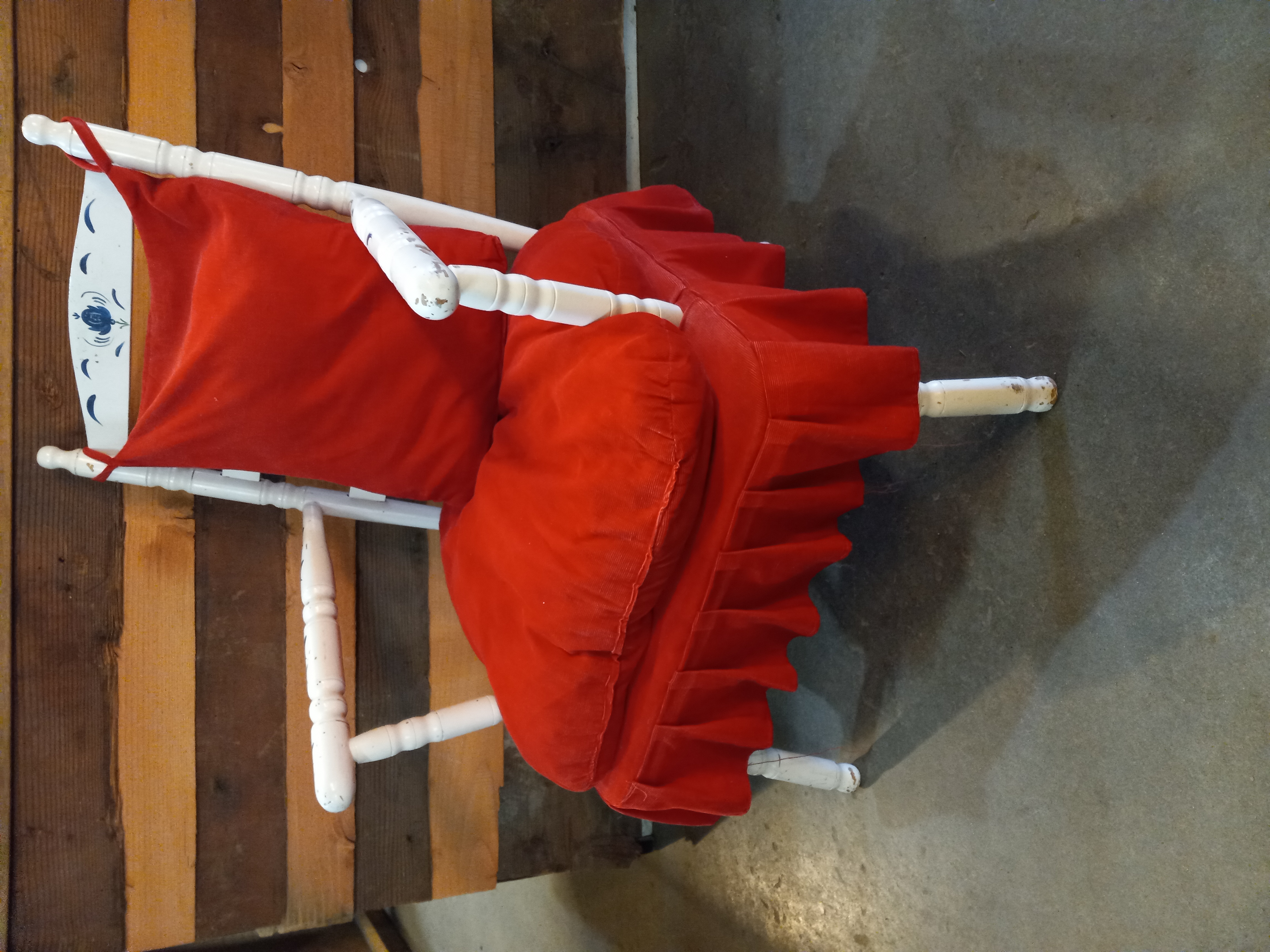 Vintage chair painted white with simple blue details. Includes two red cushions.