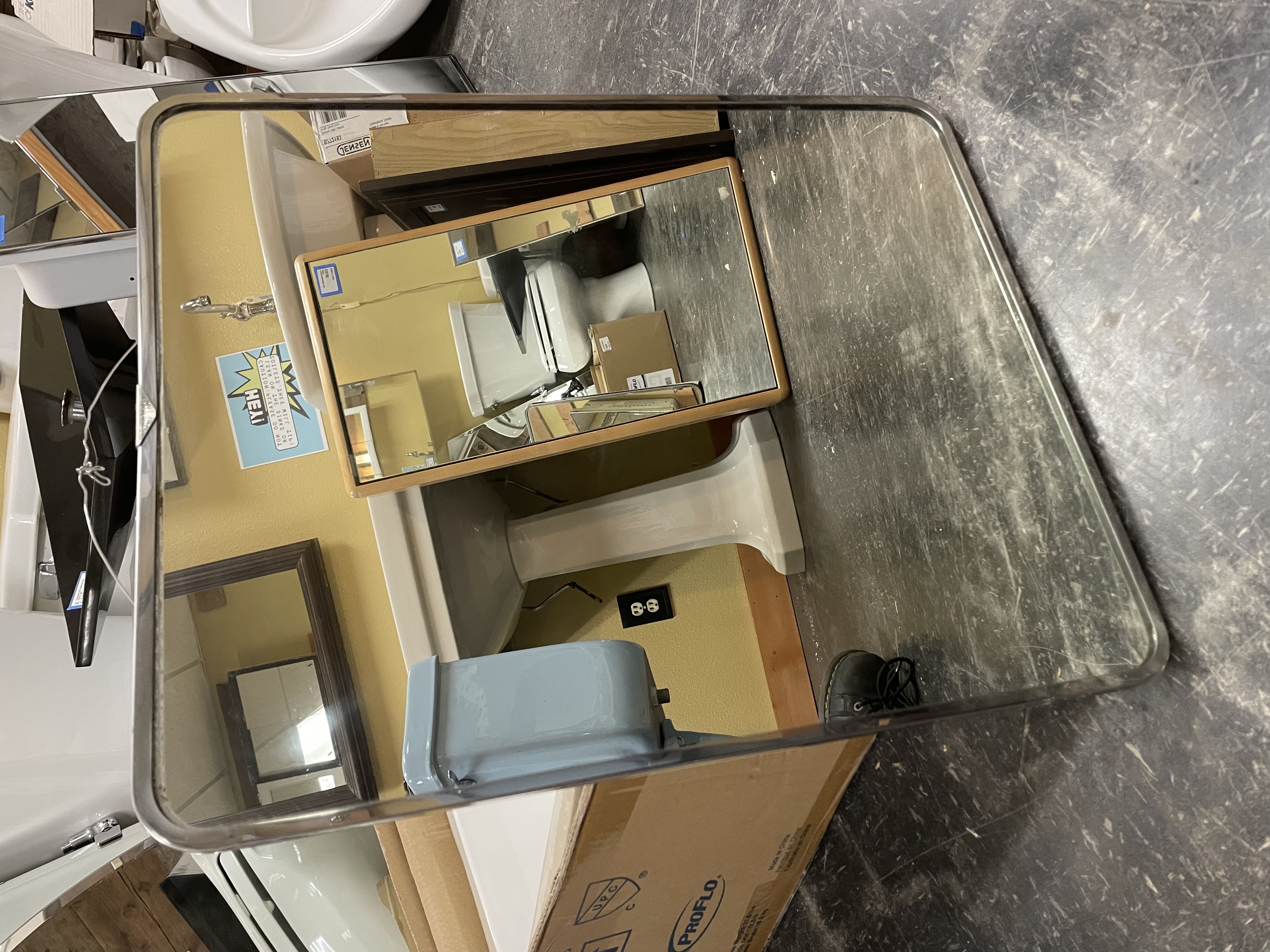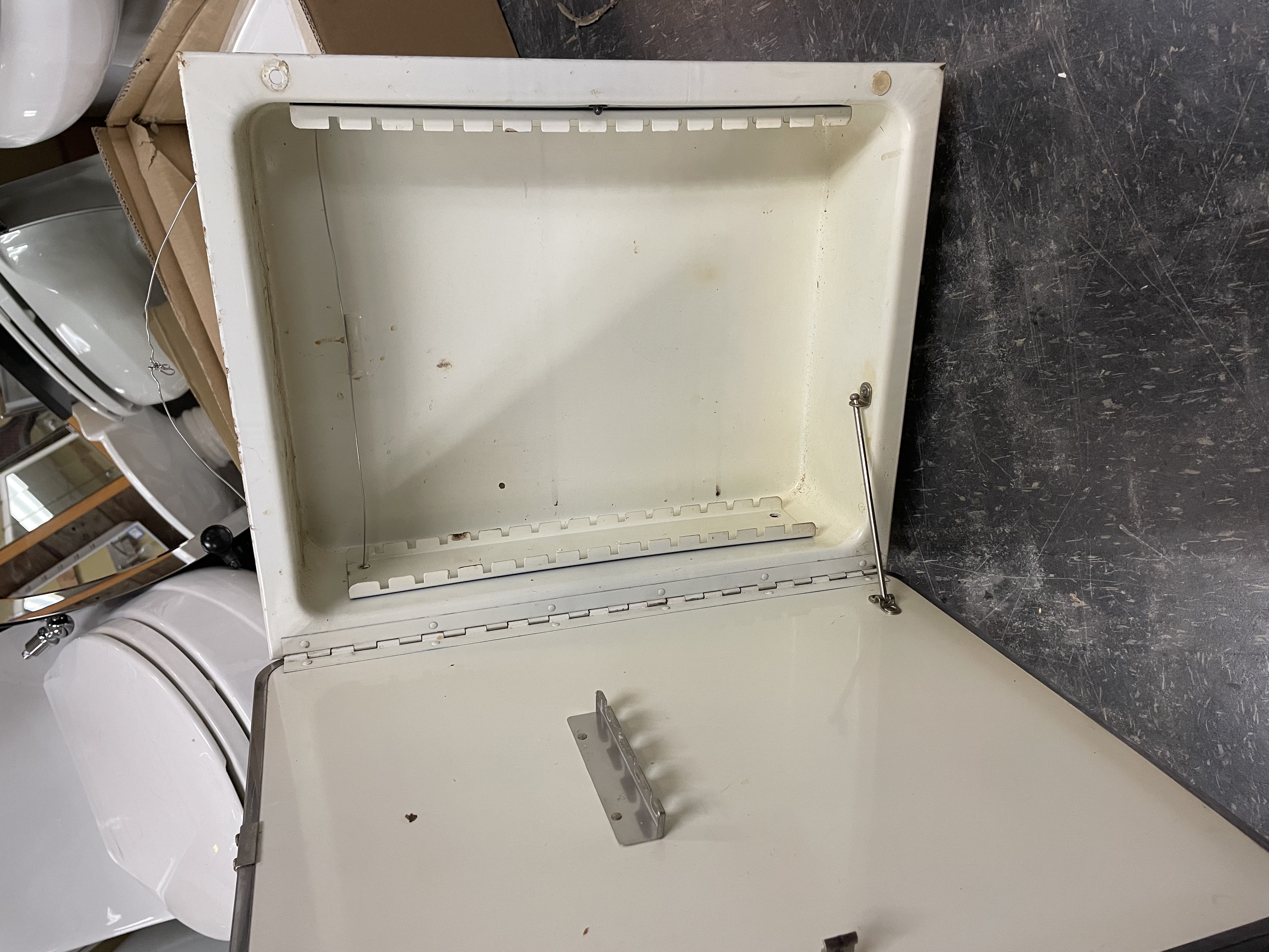 In good condition. Metal cabinet with mirror door. No shelves inside but plenty of slots for glass shelves. Features sliding support hardware for the door and holders for toothbrushed or razors.