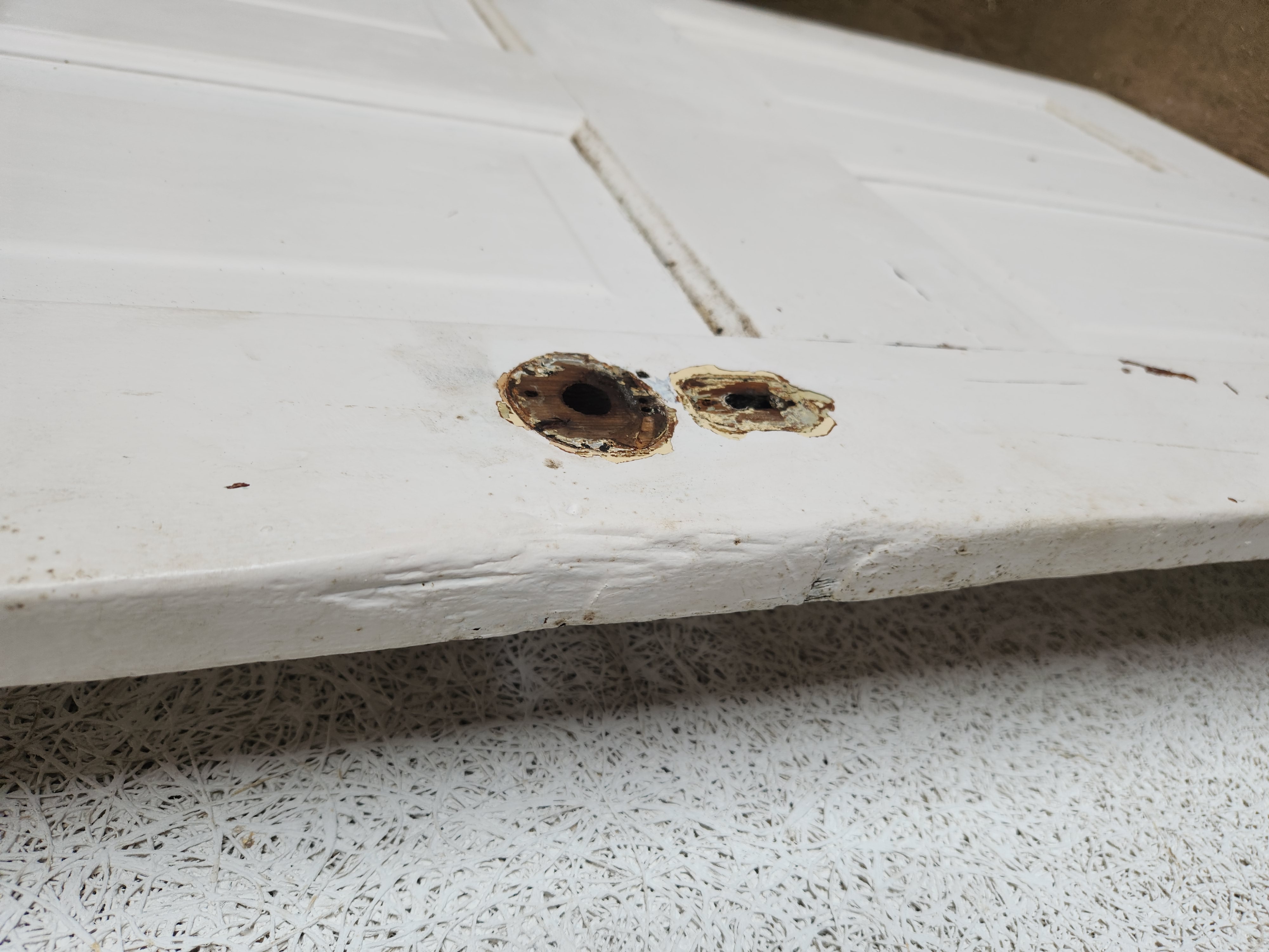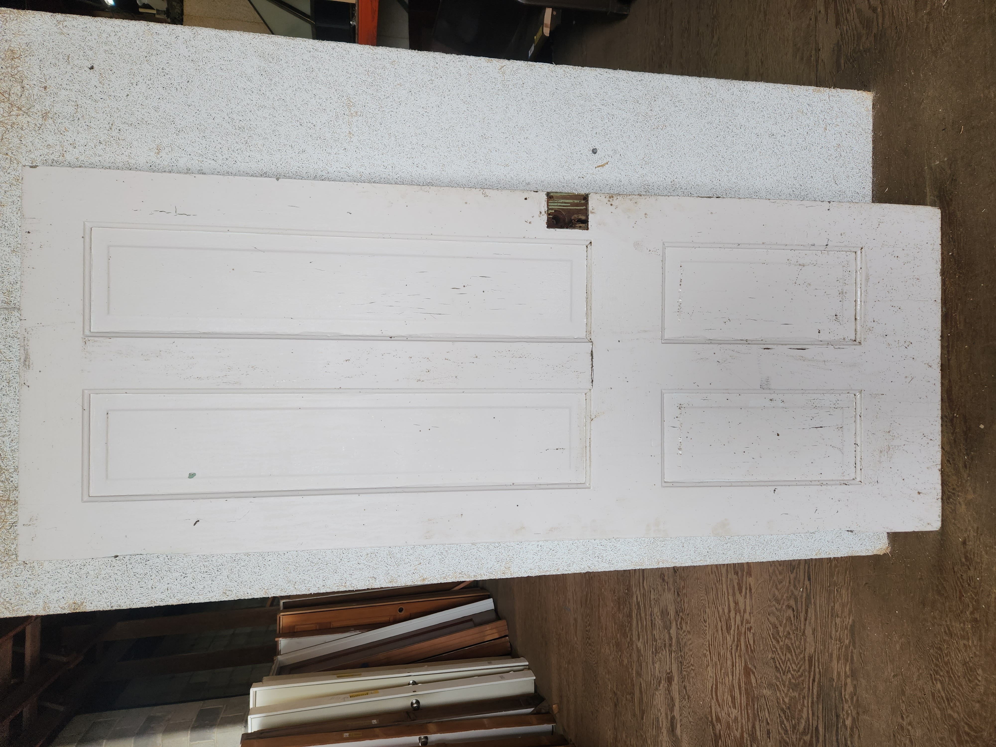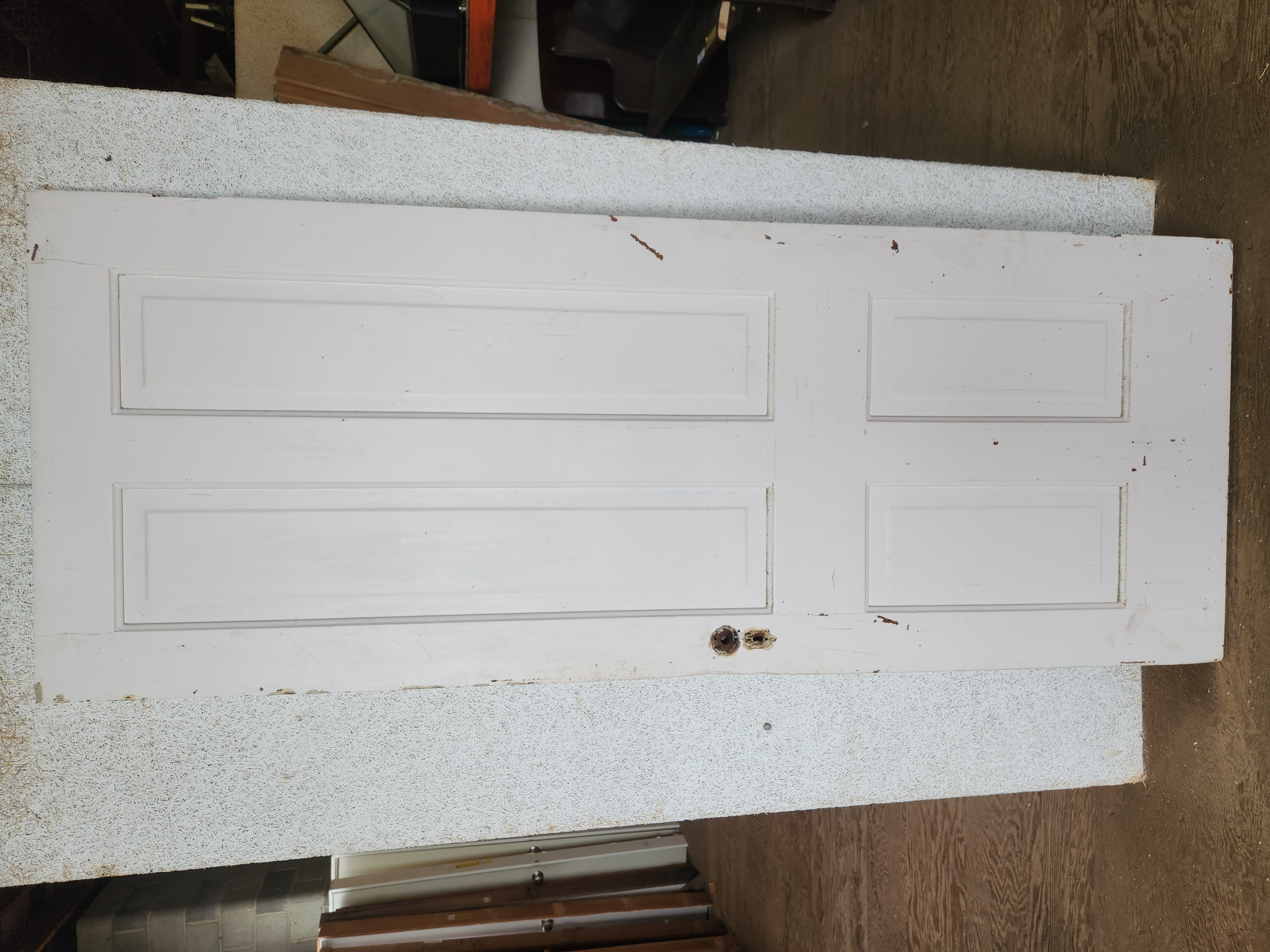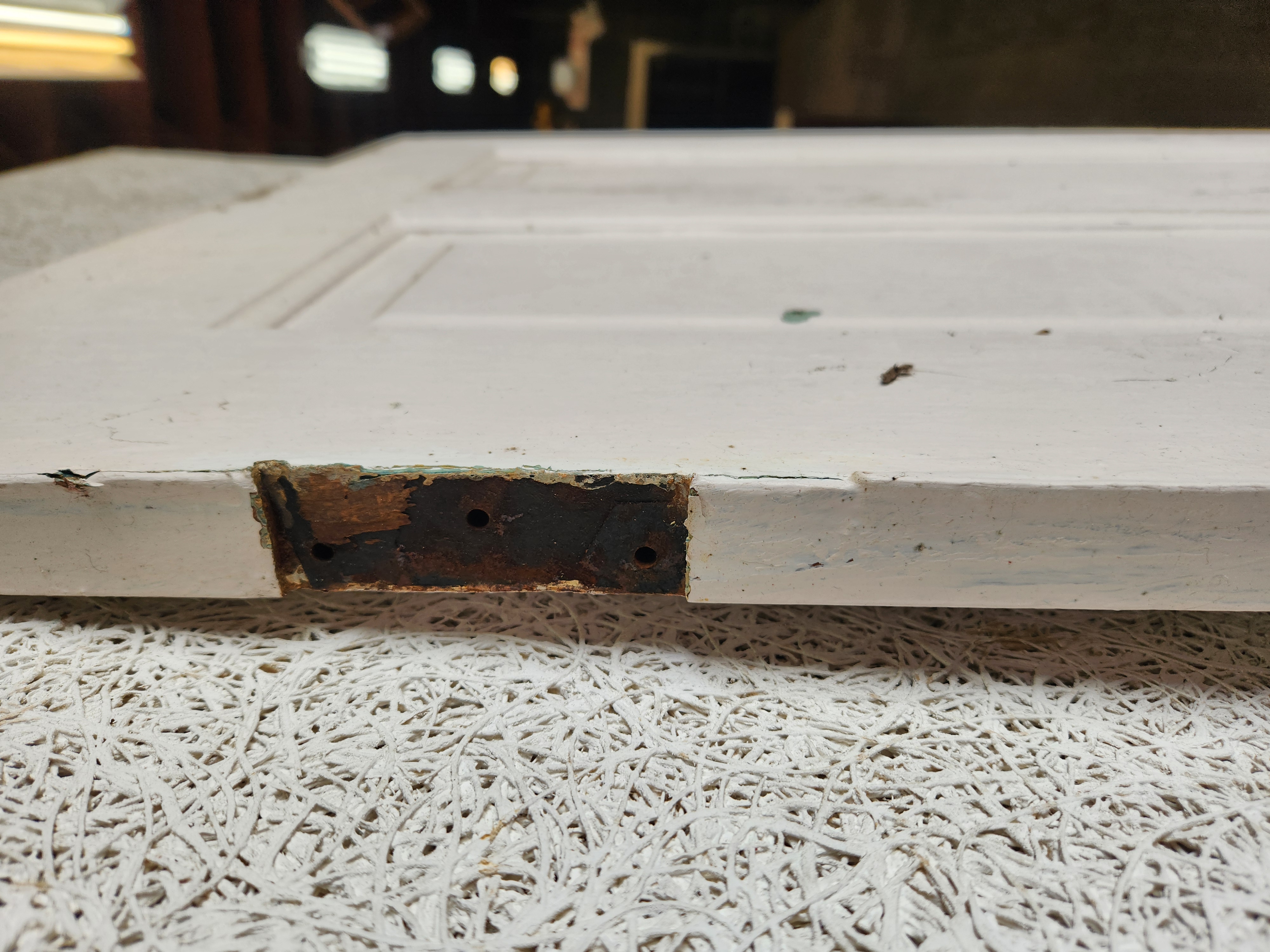 Victorian door that is in fair condition. It has many layers of paint and some wear on the side. It measures 30 x 77.25 inches and has an open swing.