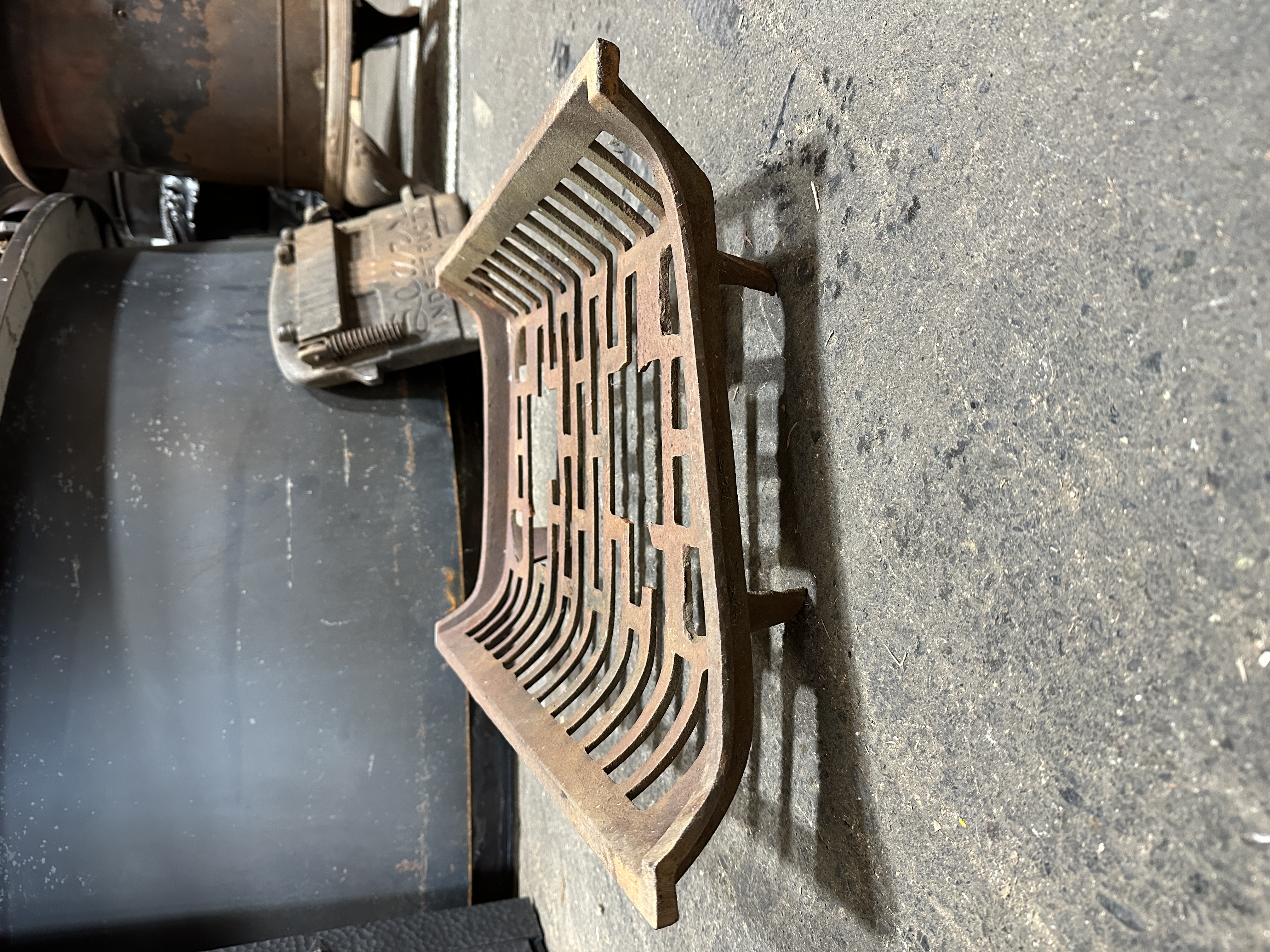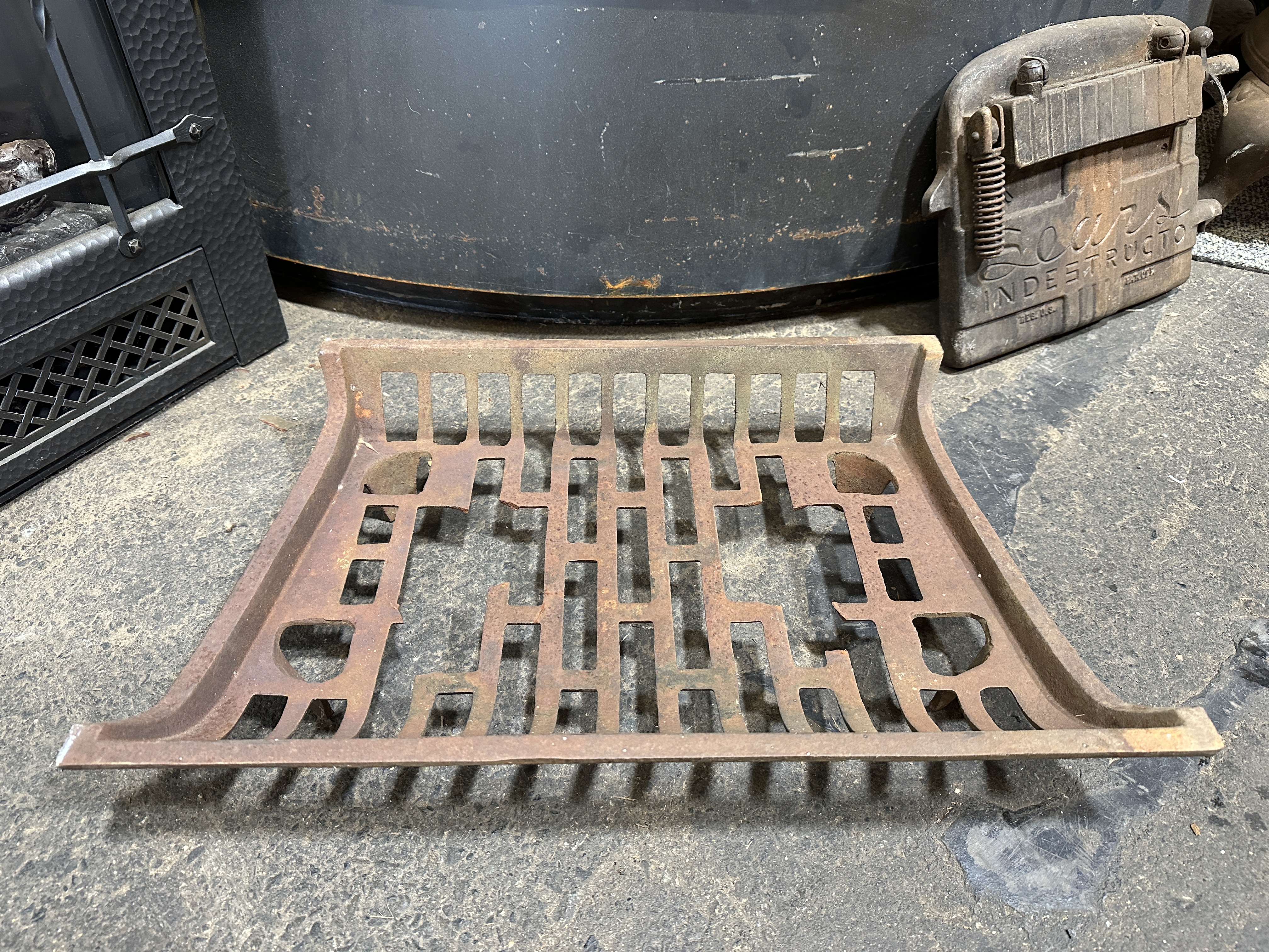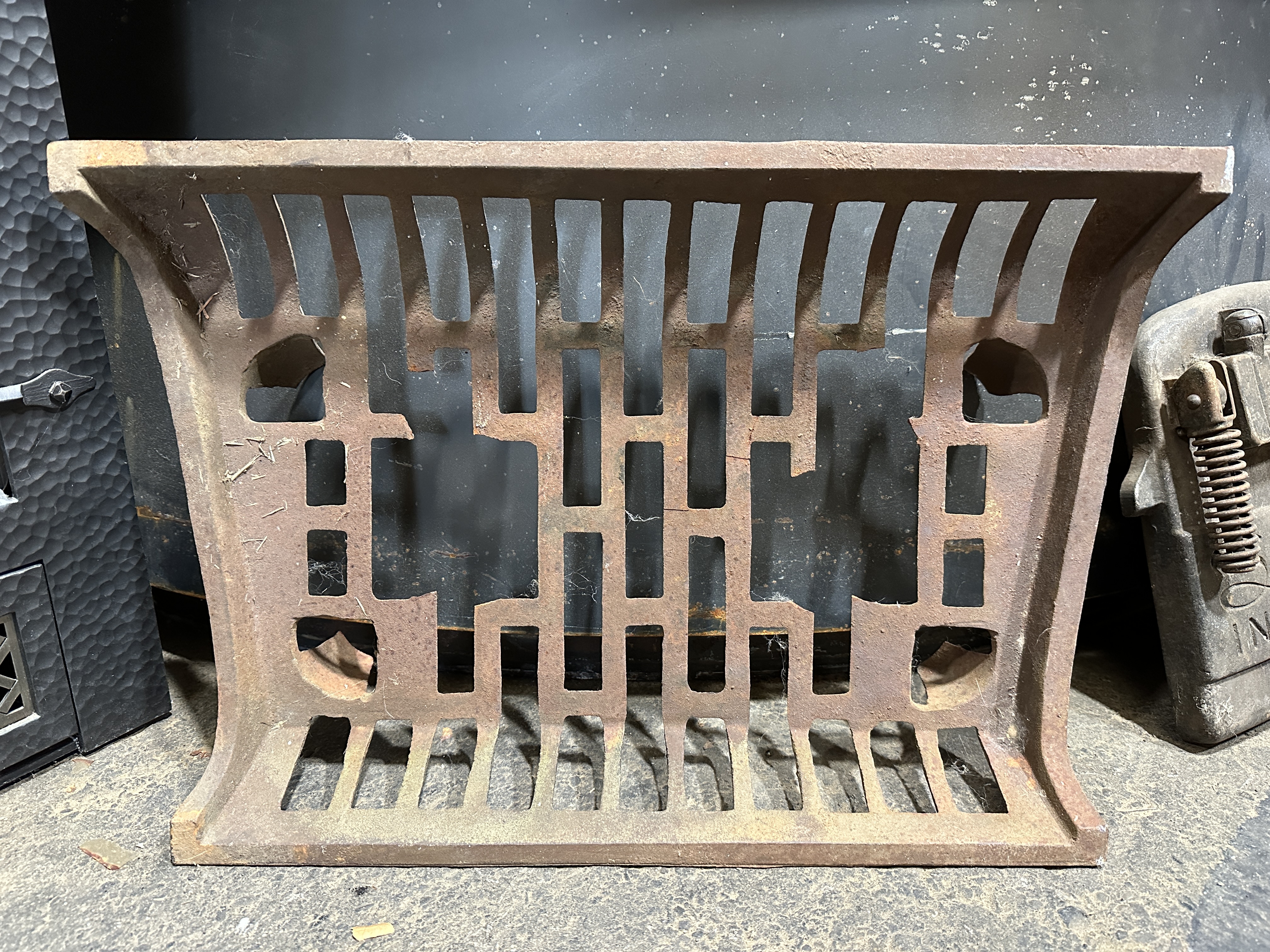 1960s fireplace log grate. Has some rust and some broken pieces in the center design but still very functional. Price reflects condition.