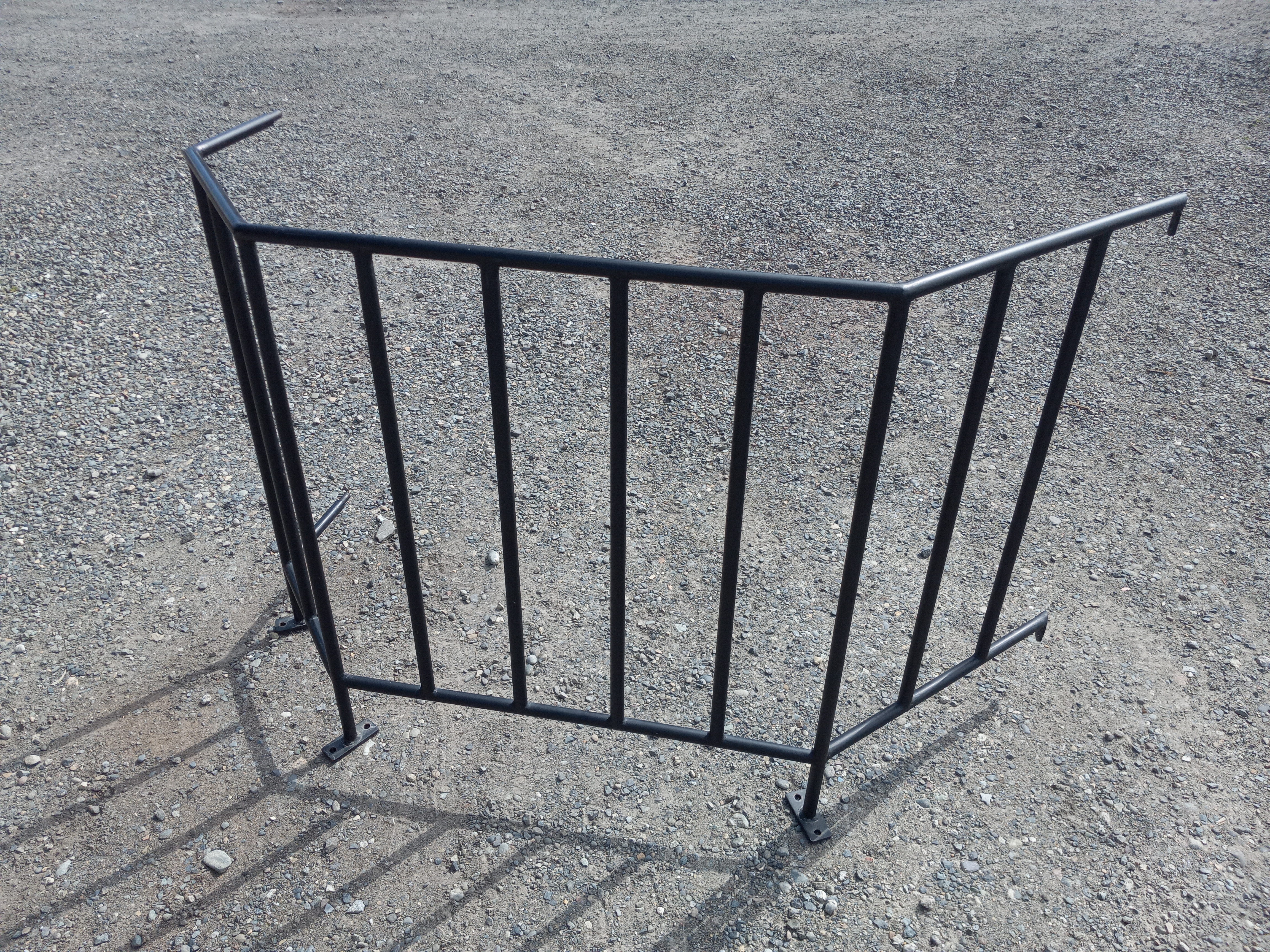 Sturdy railing for a balcony. Measures 54 inches wide, 19 inches deep, 36.5 inches tall. Weathered but no apparent structural damage.