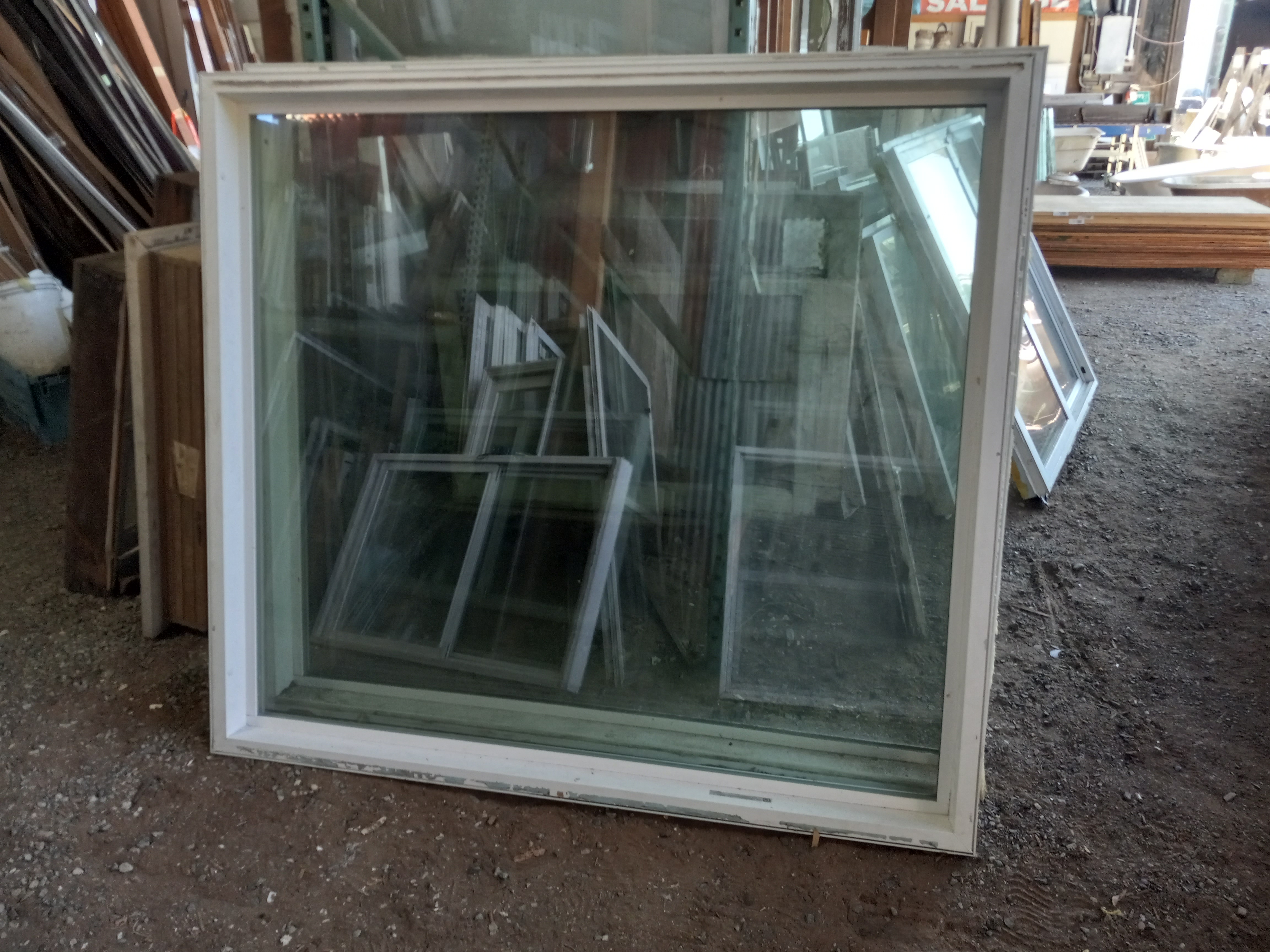 Vinyl fixed window in fair condition.