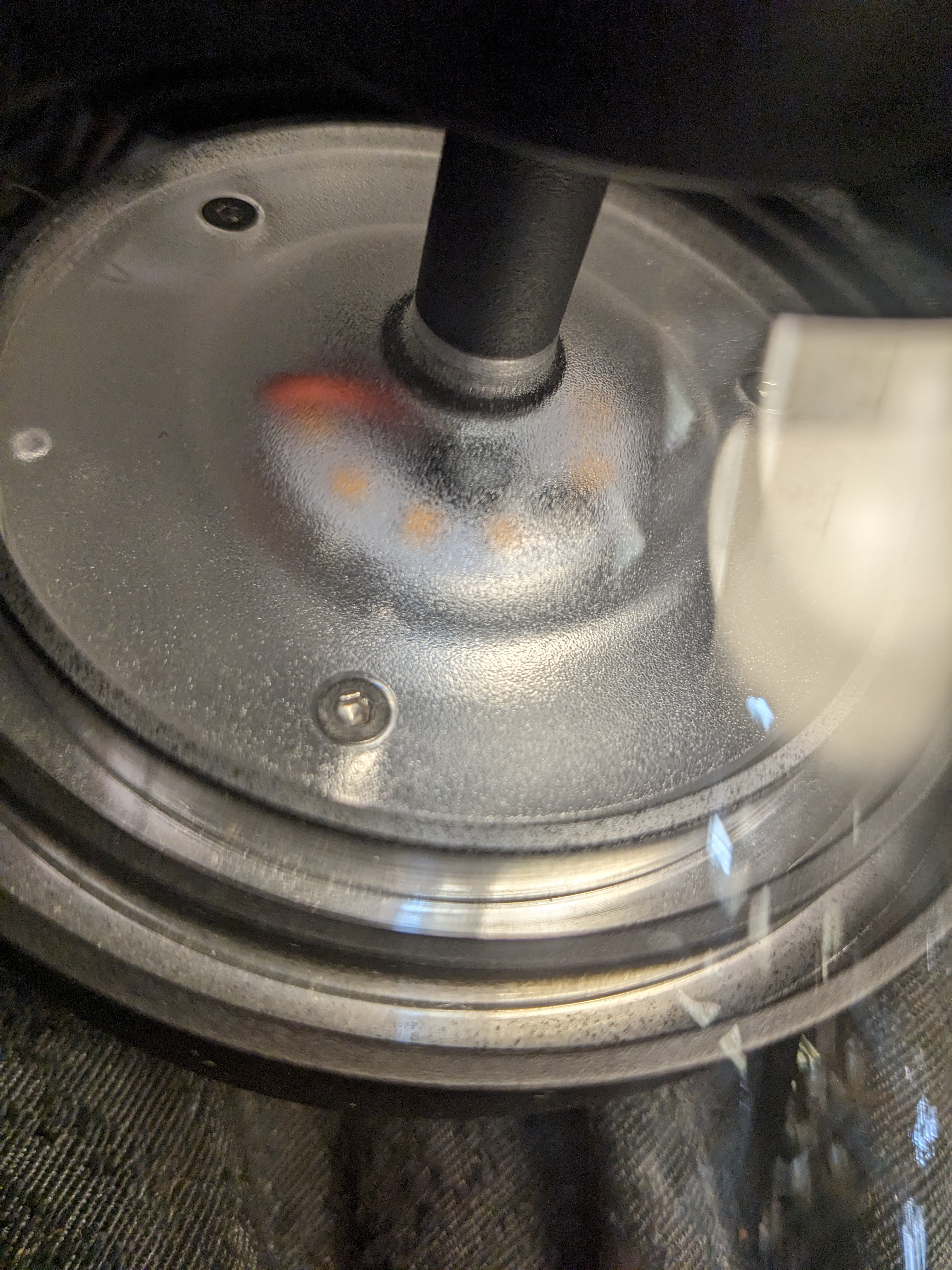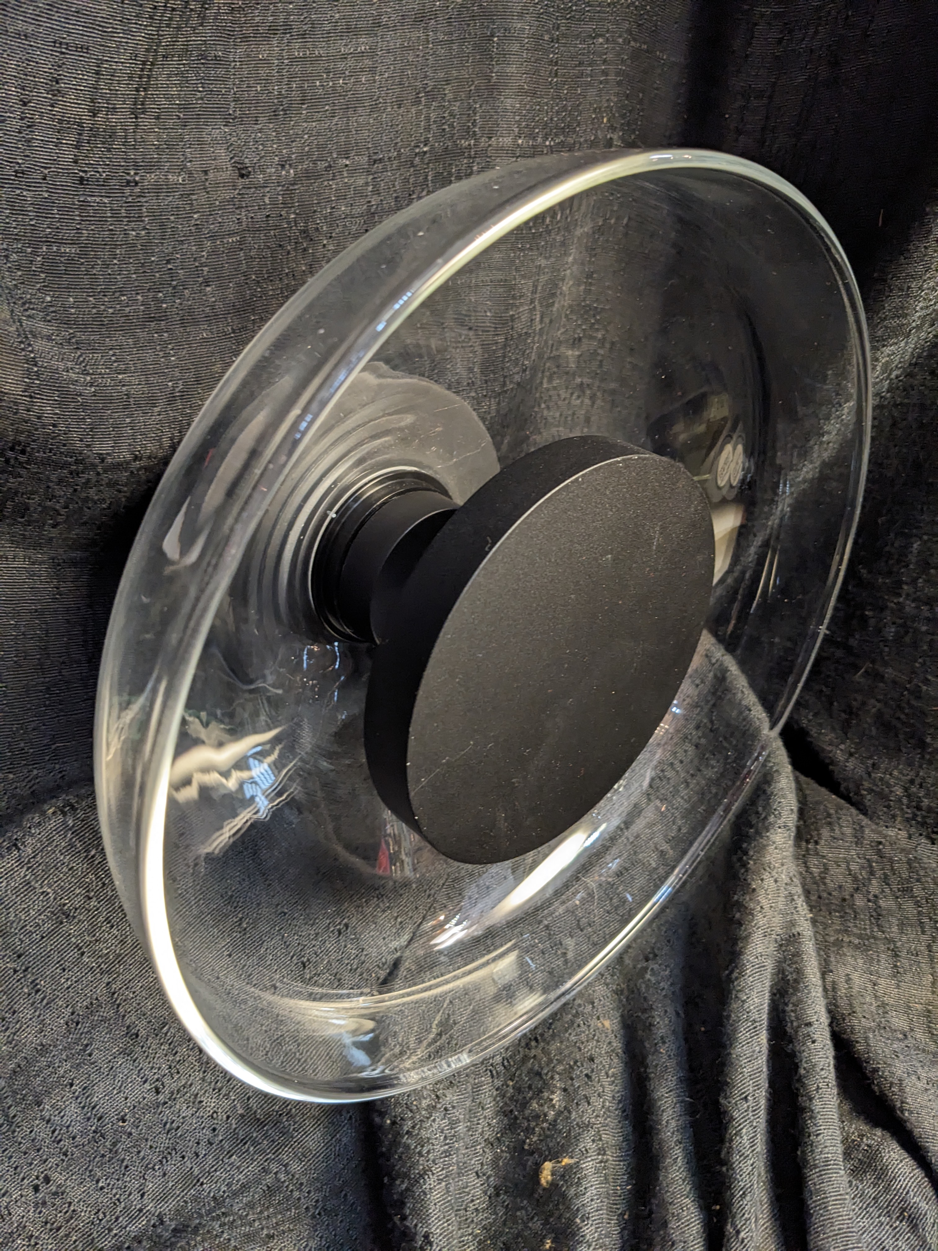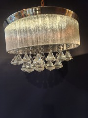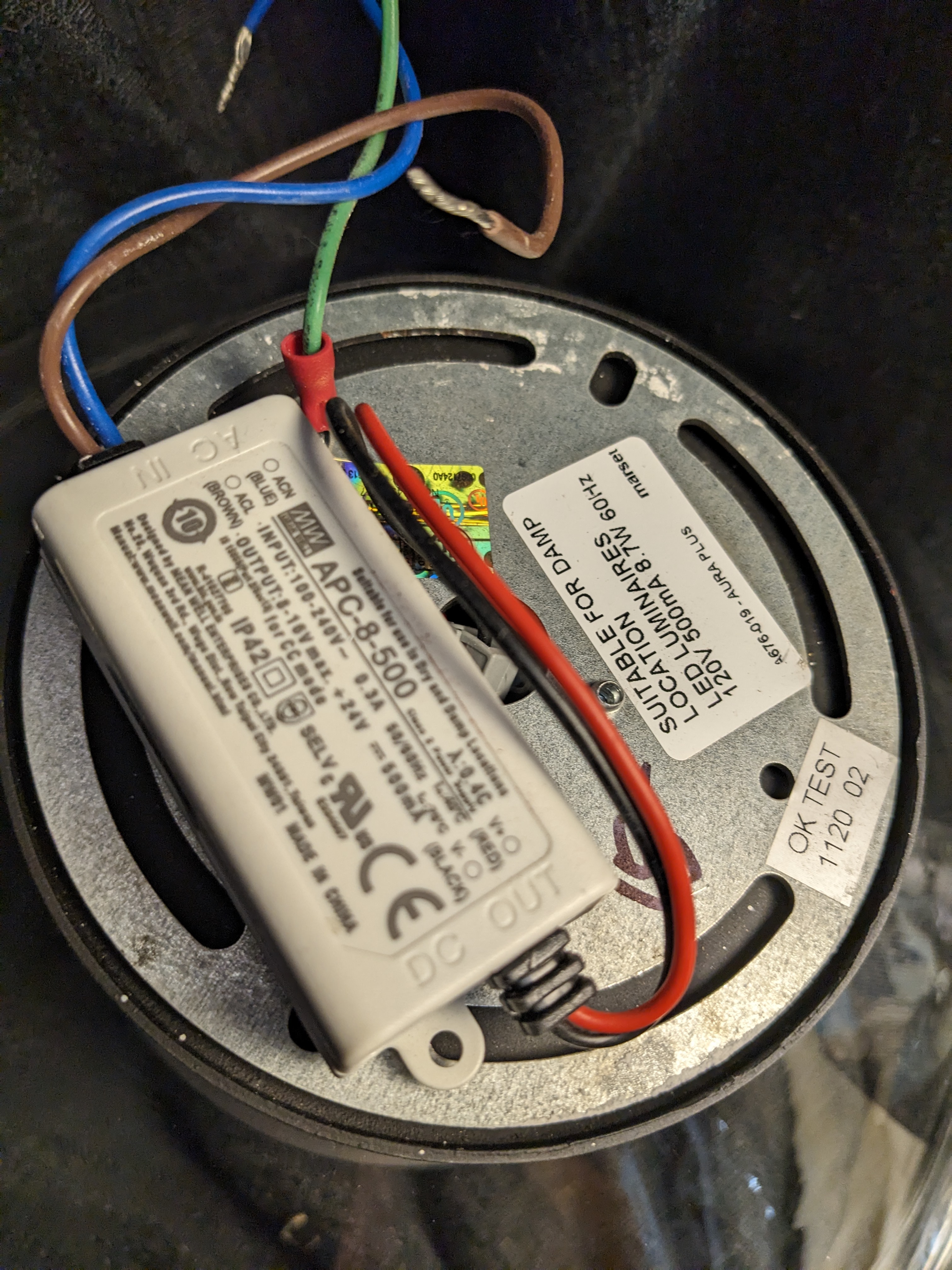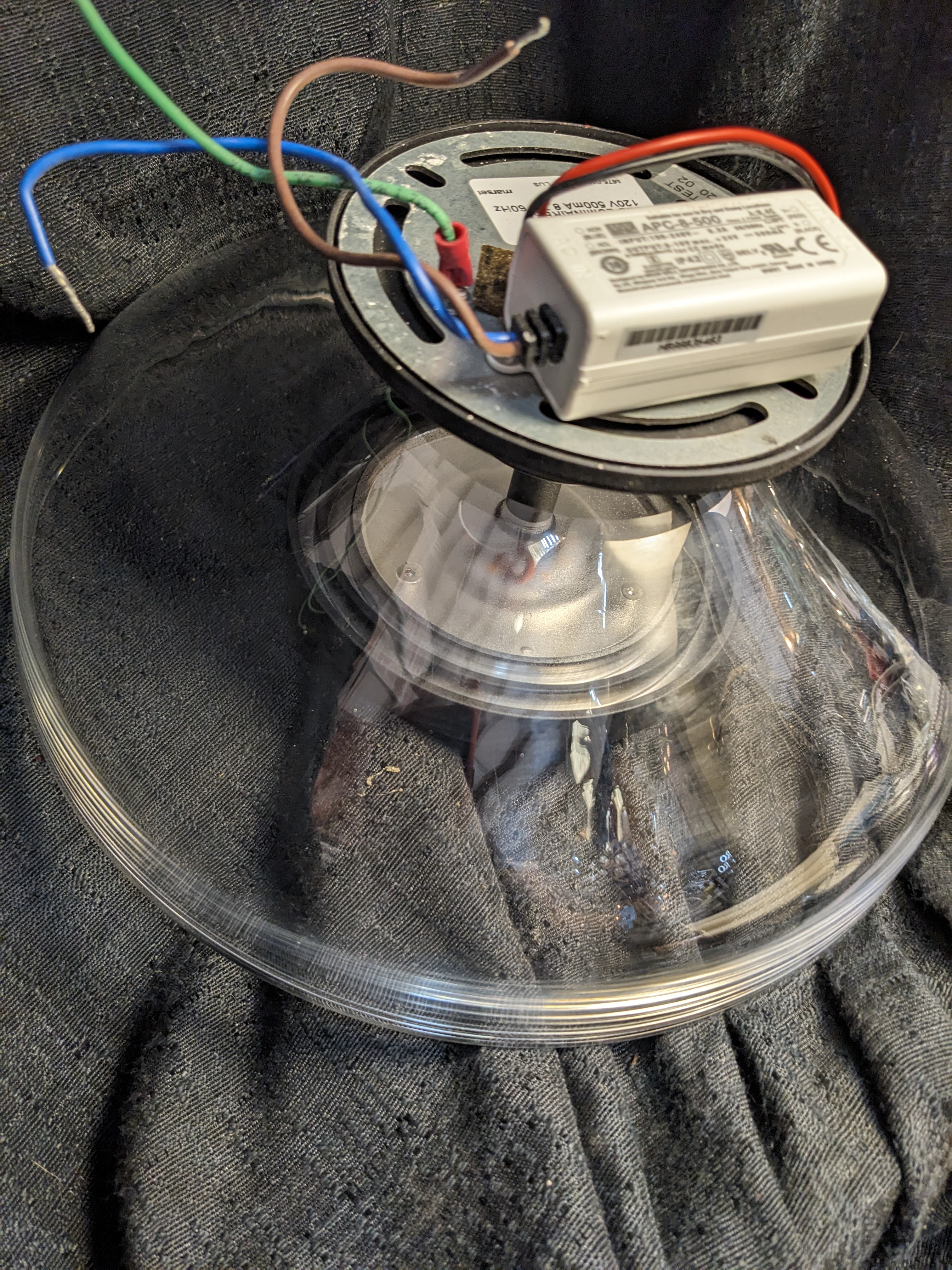 Very shallow, great for a low ceiling. The LED is behind the black center disk. This avoids any direct glare and wind it instead to reflect from the ceiling.