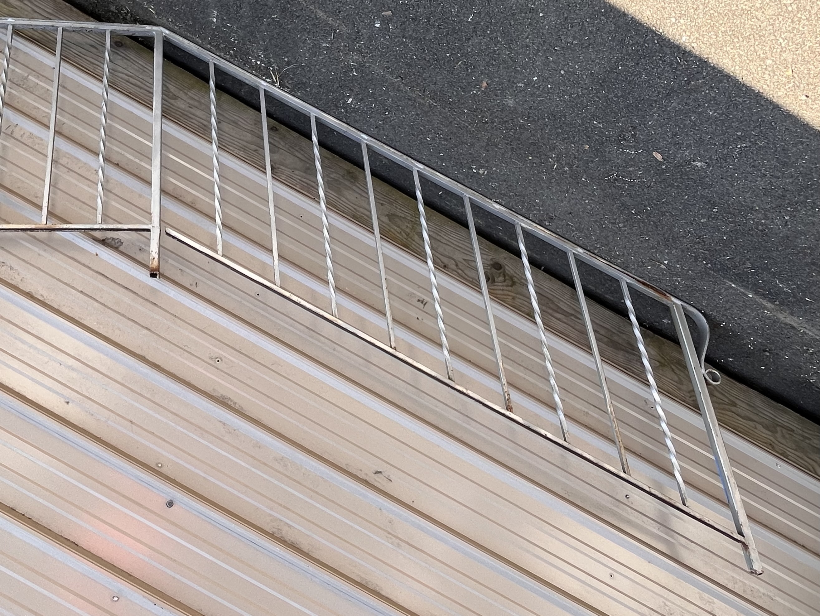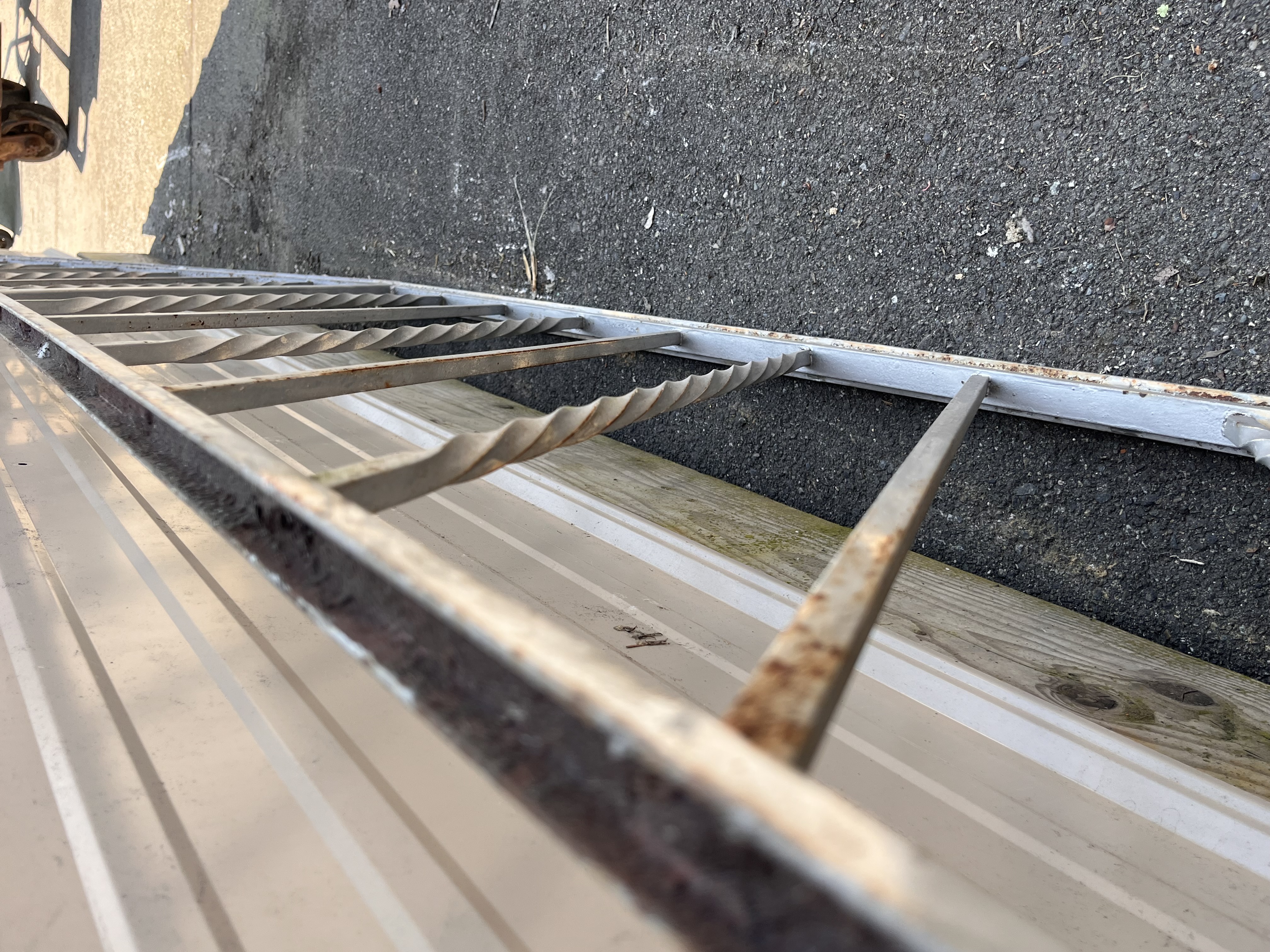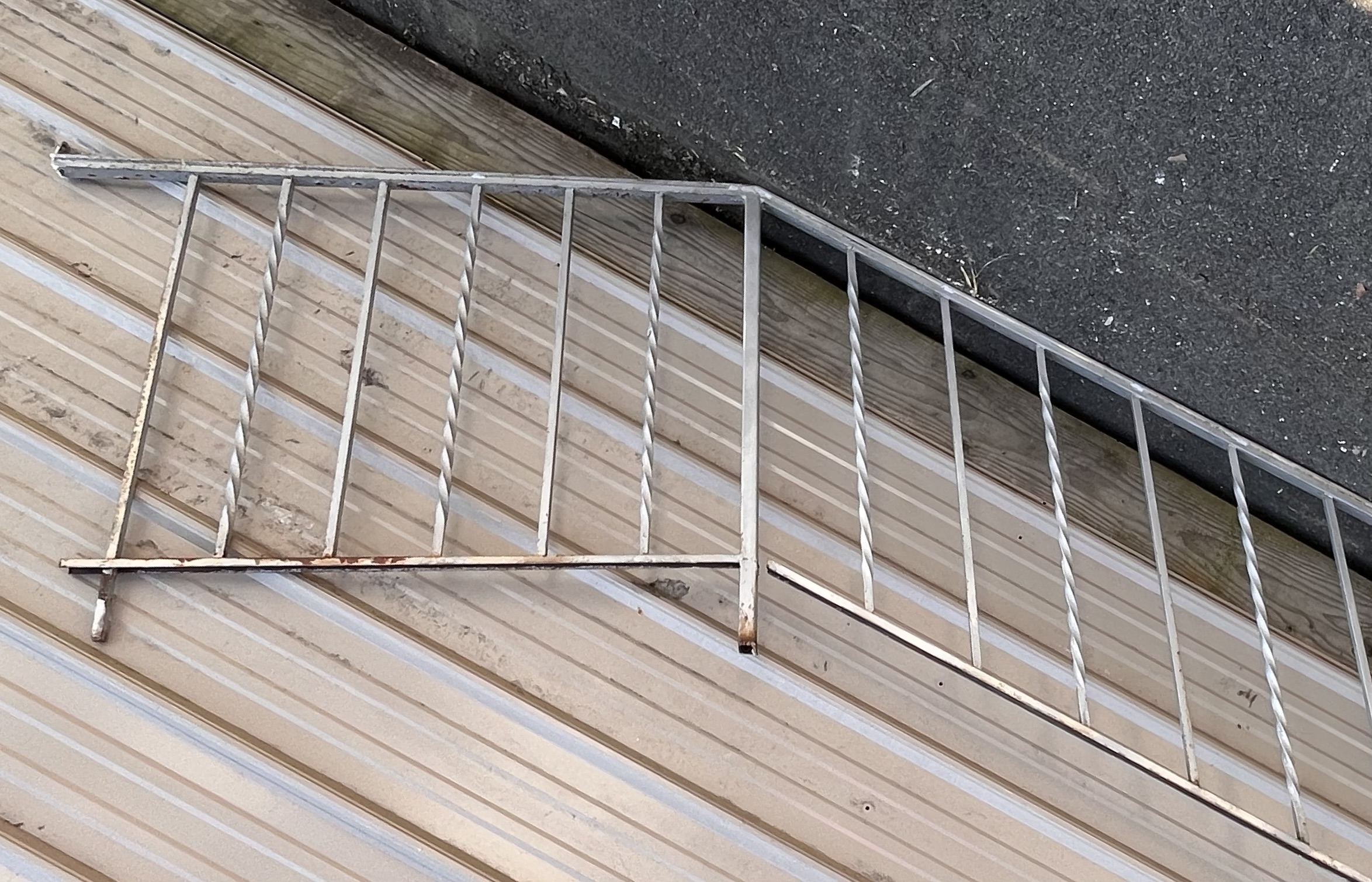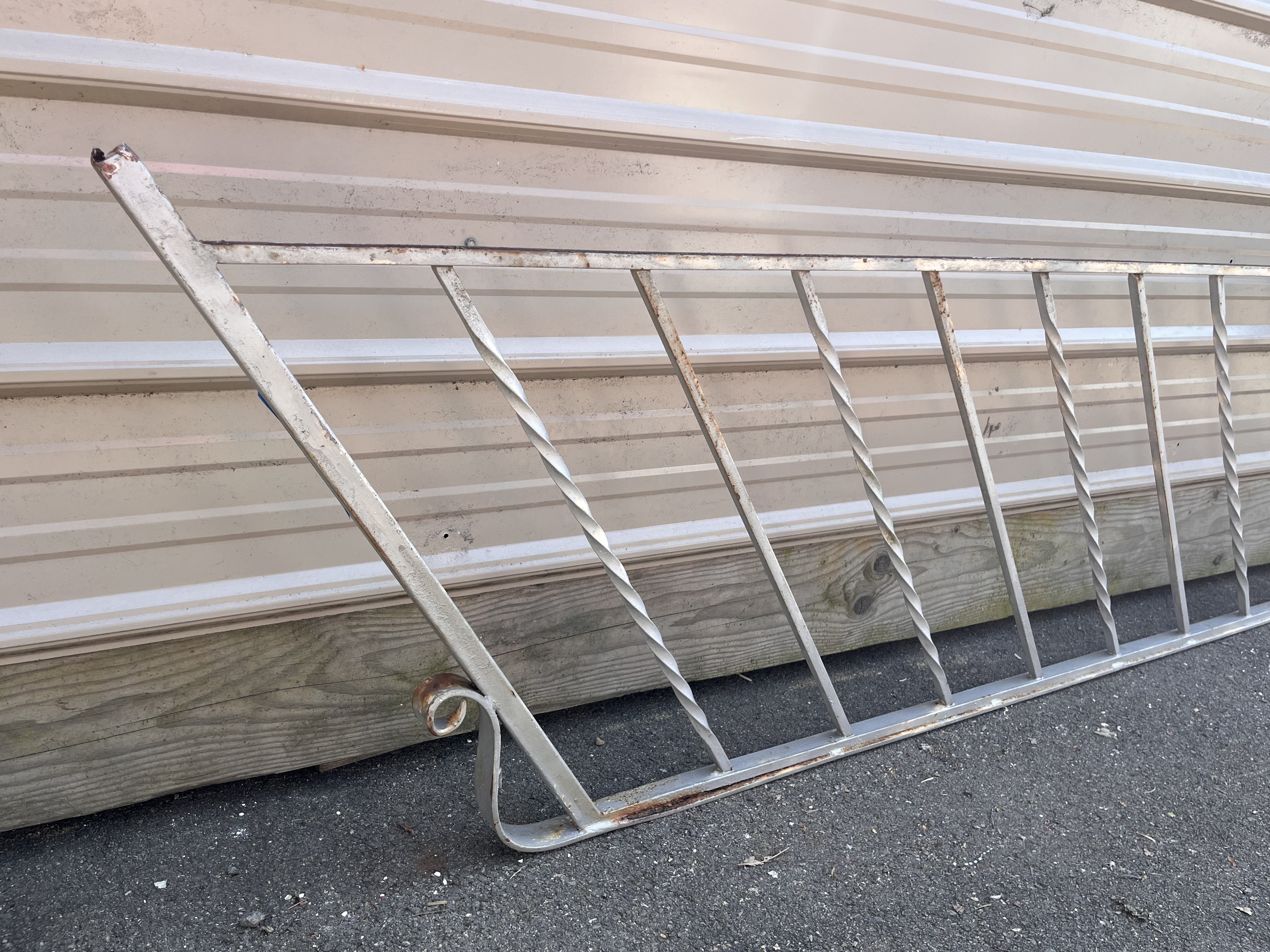 This fencing is in fairly poor condition, with visible rust and chipped paint. However, it remains light yet sturdy. The fencing is designed to straighten out at the top as it is shown in the photos.