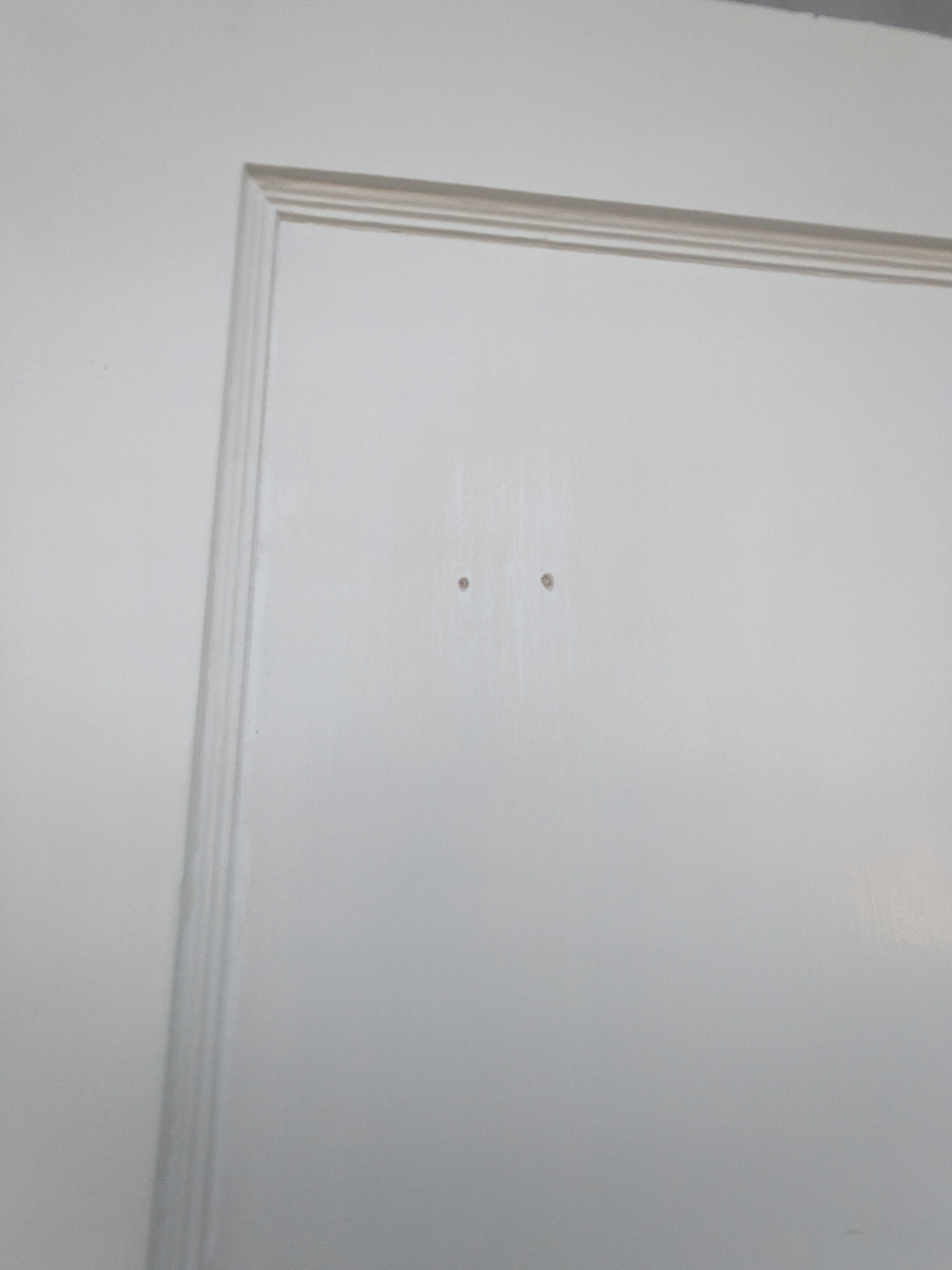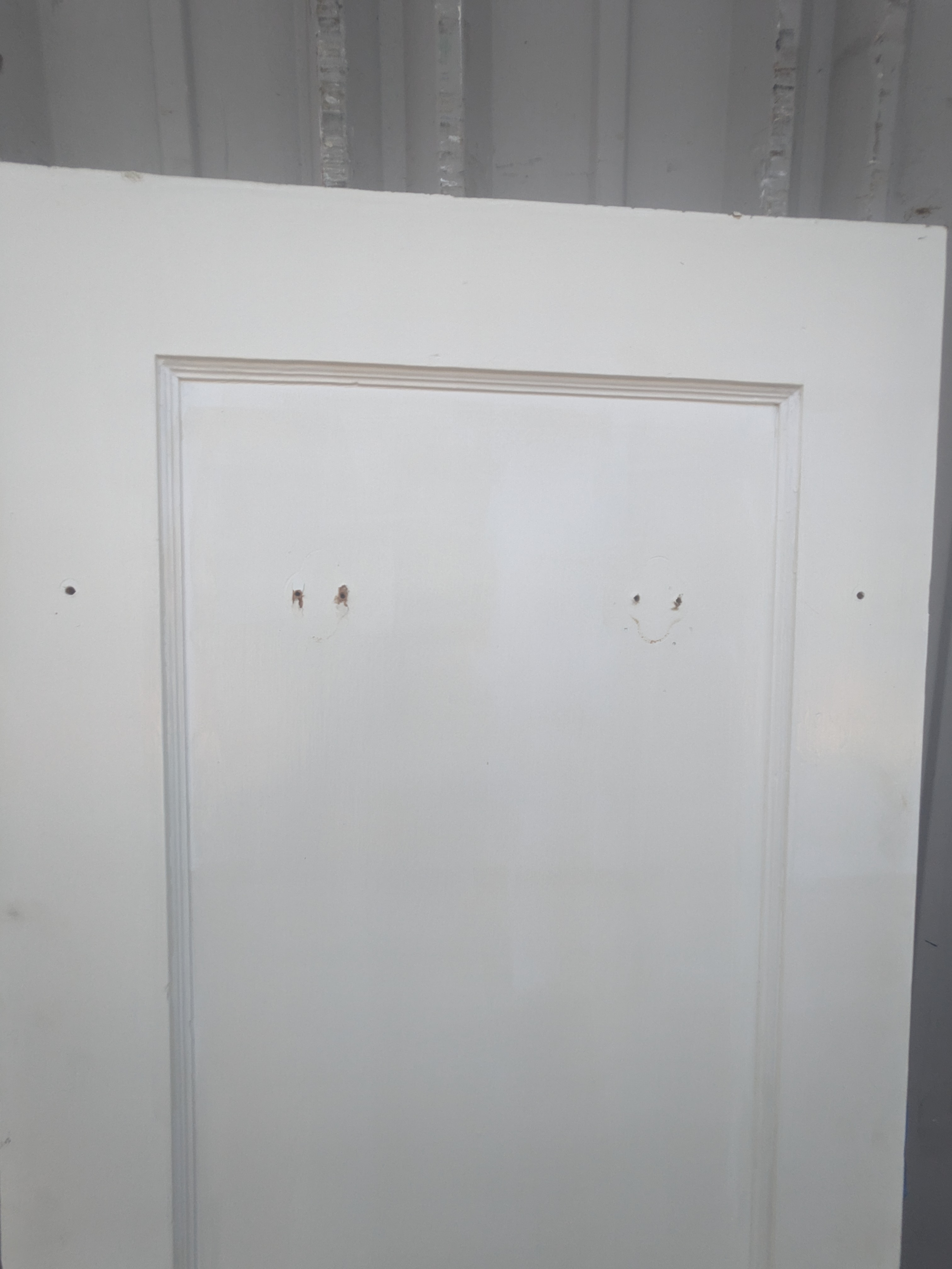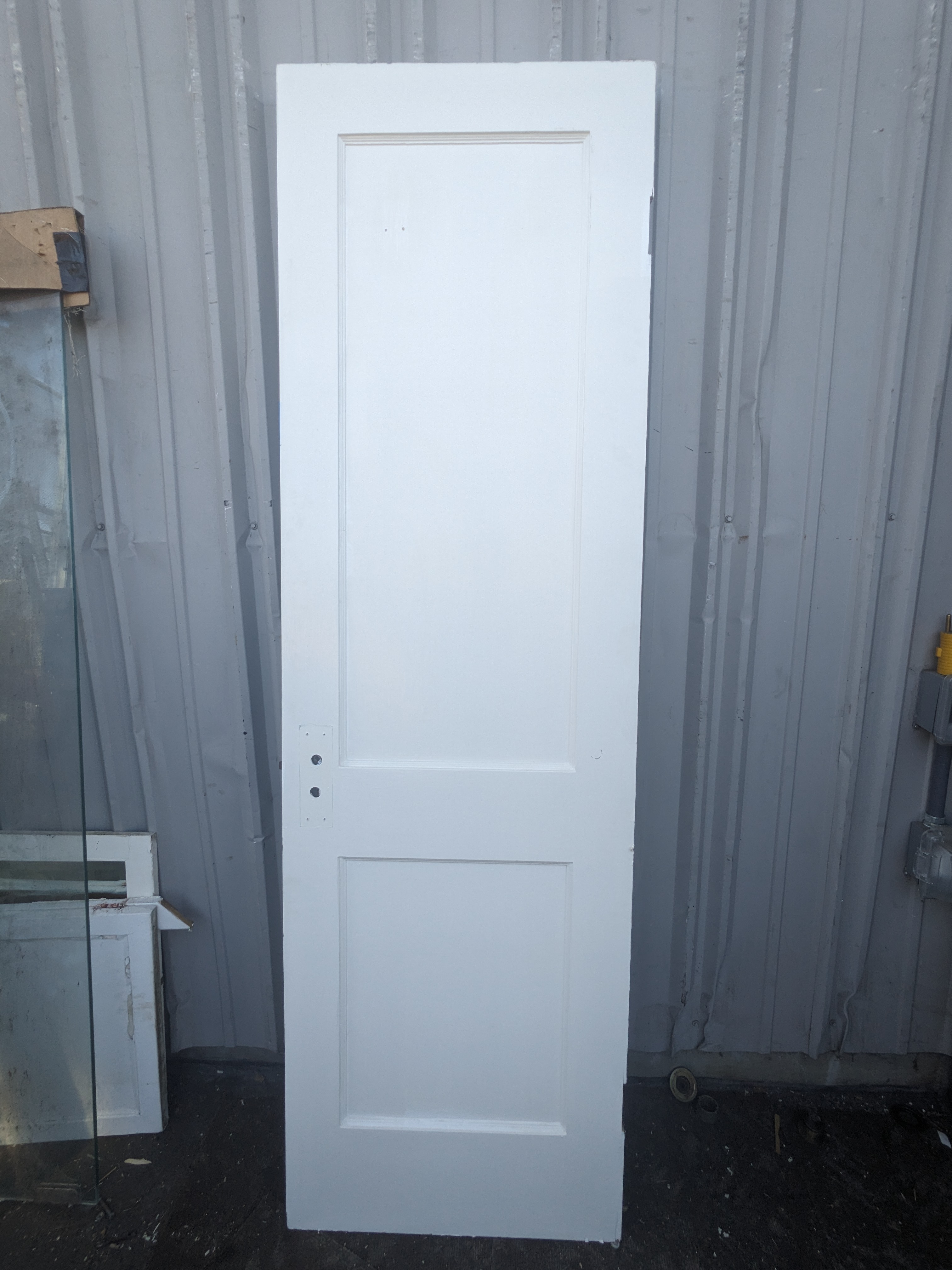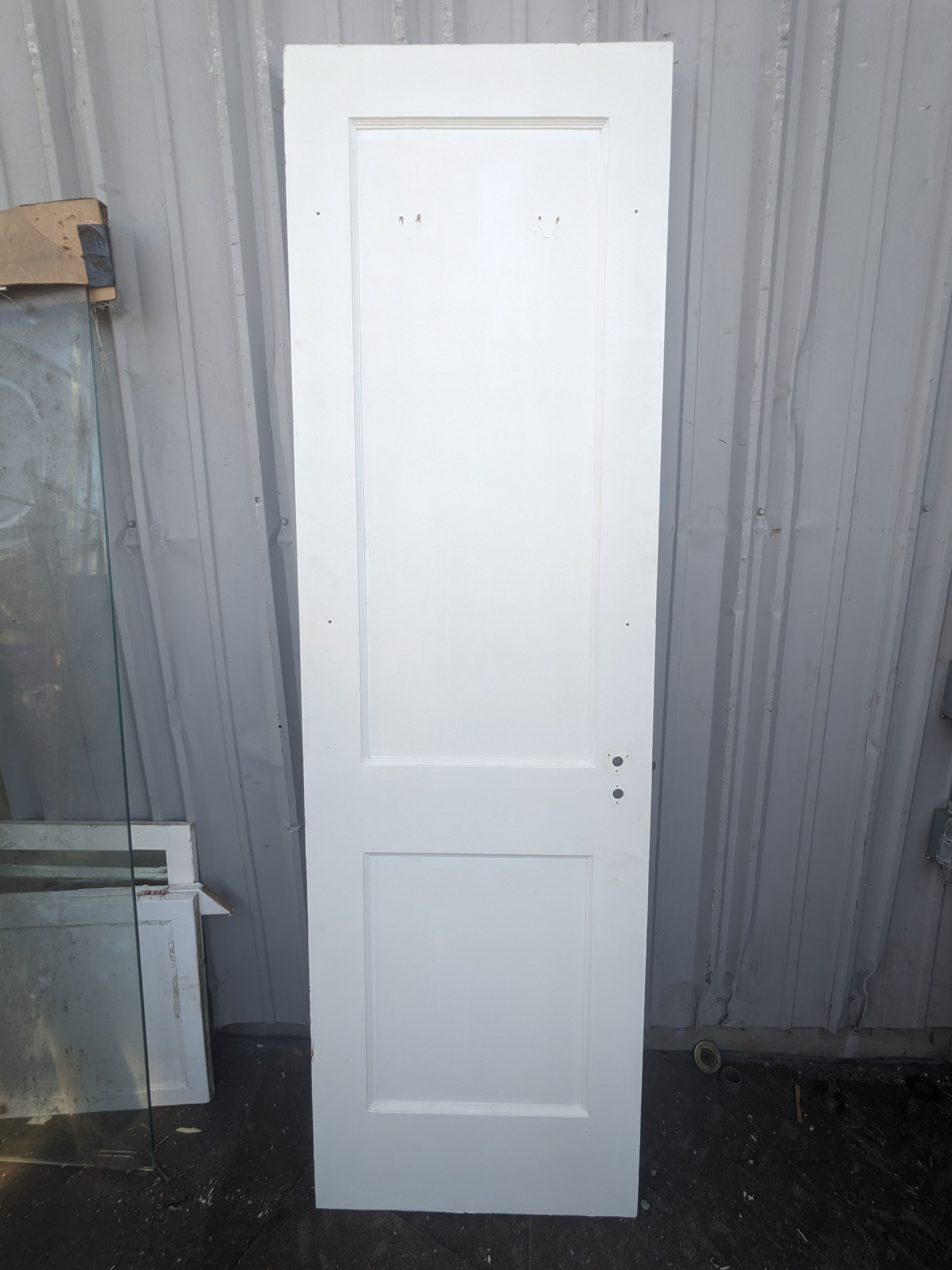 A two panel interior door that's been painted white. This door is in good condition, with some chips and cracks in the paint, and a few drill marks. This door measures 24 x 79 inches and has a left inswing.