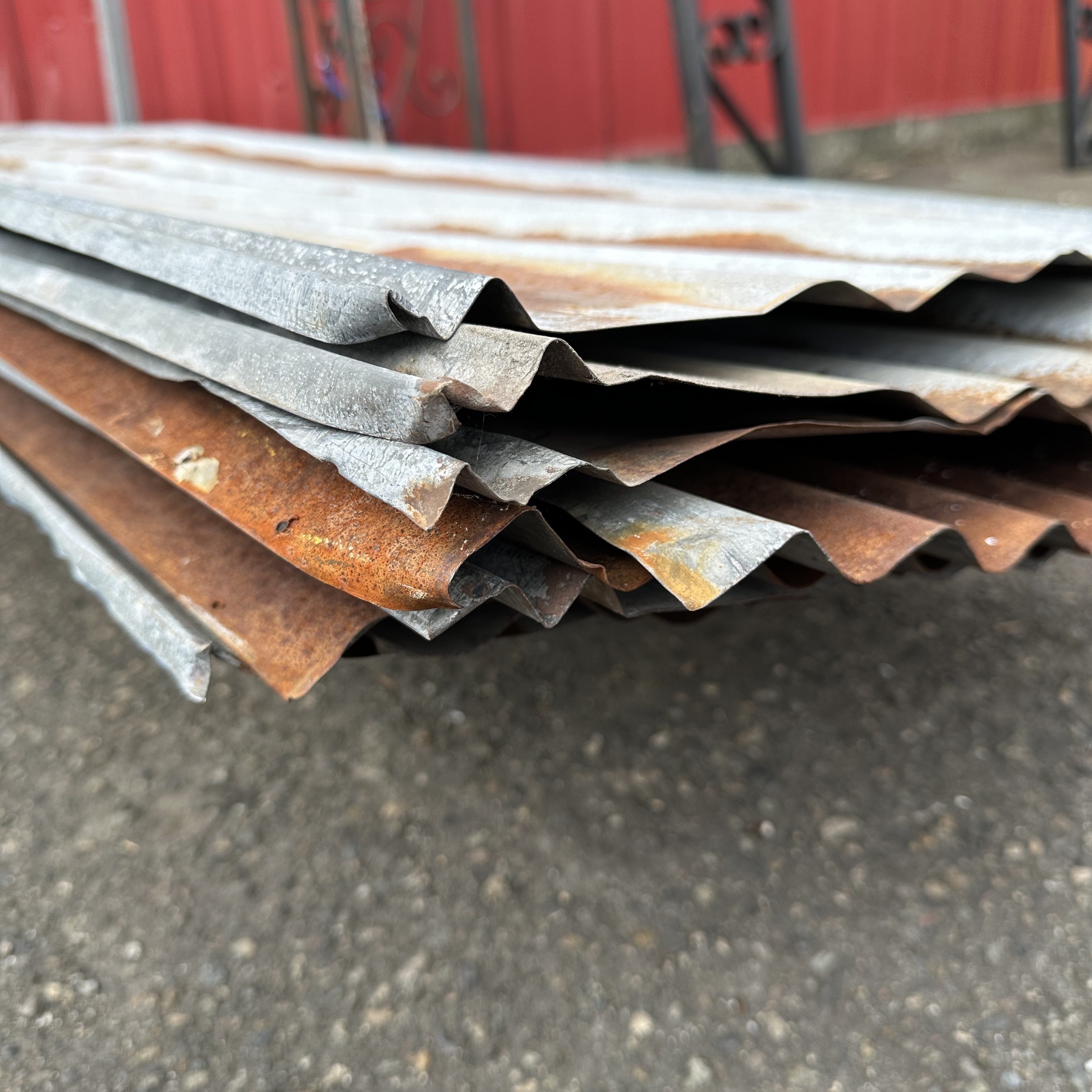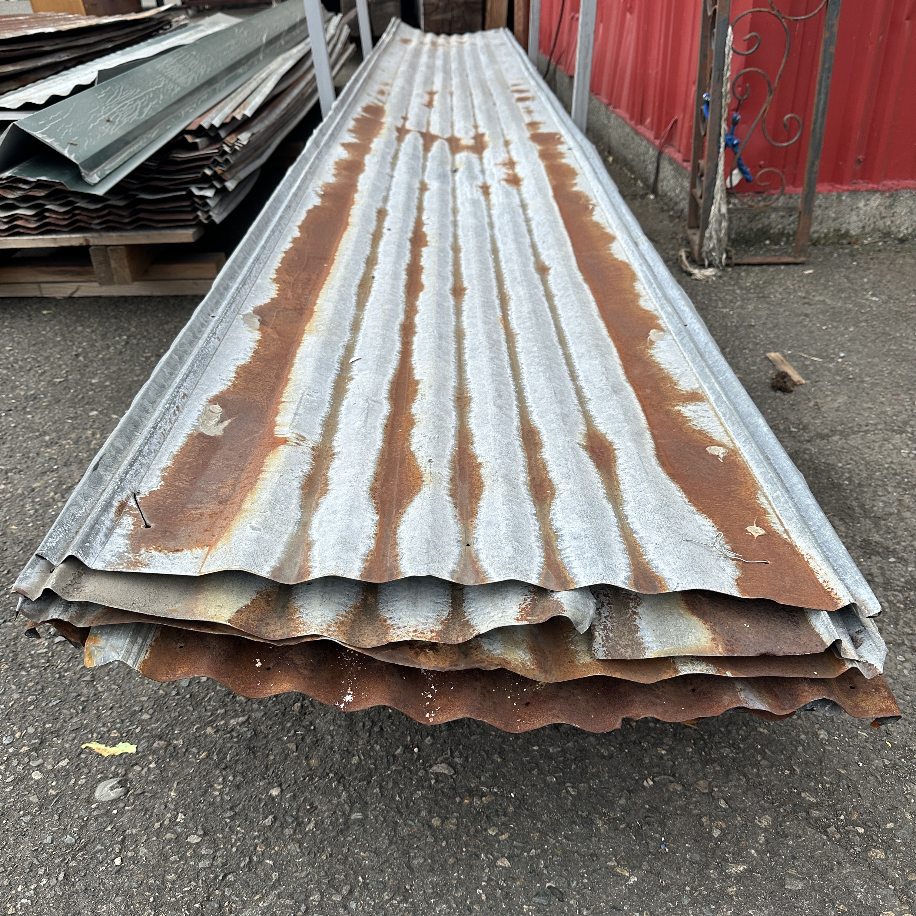 Approximately 25.5 x 192 inches of vintage corrugated metal roofing sheets. All have been previously used and have random holes where it had been screwed down and all have rust to some degree. No two are exactly alike. Photos may be representational.