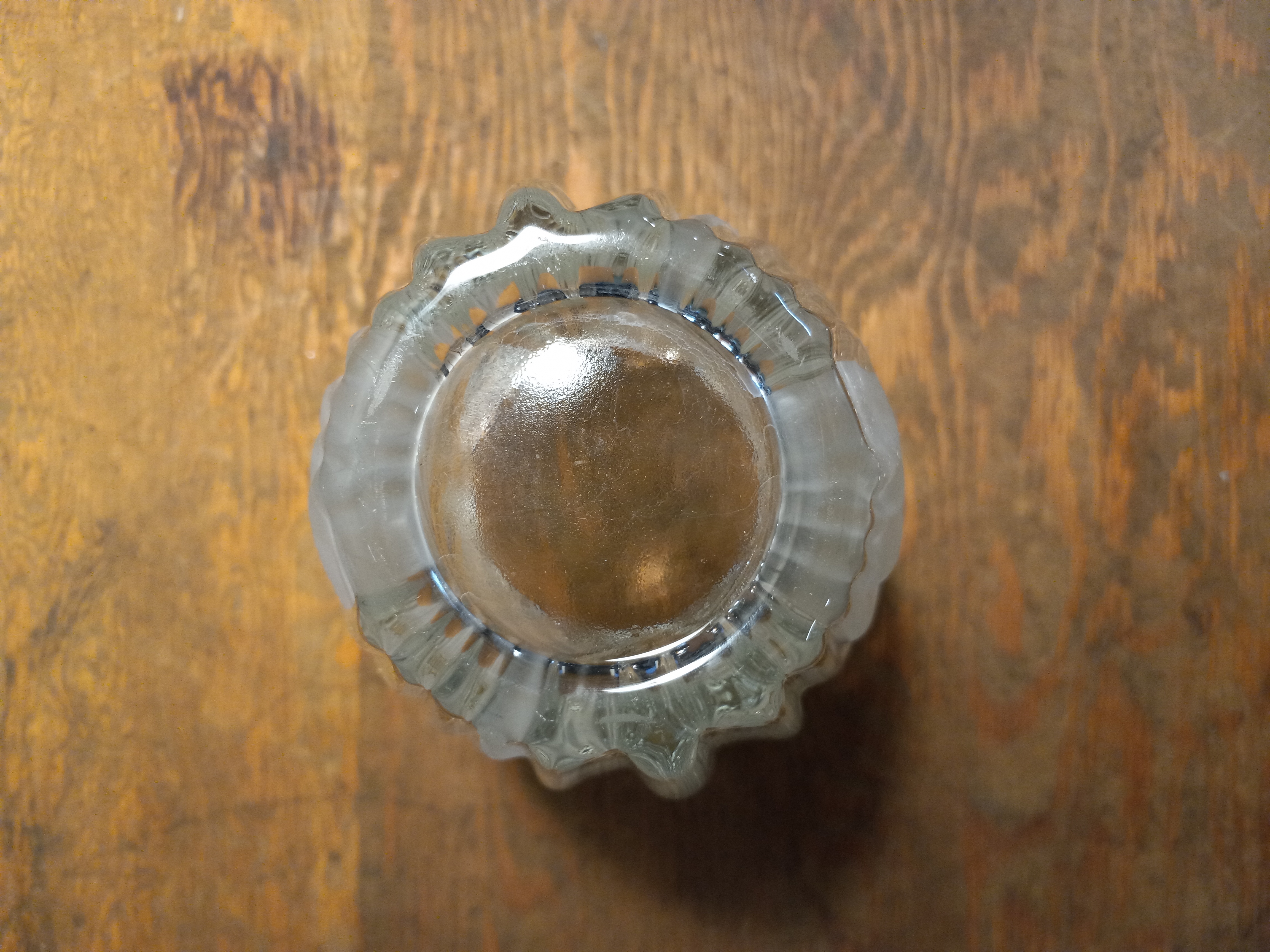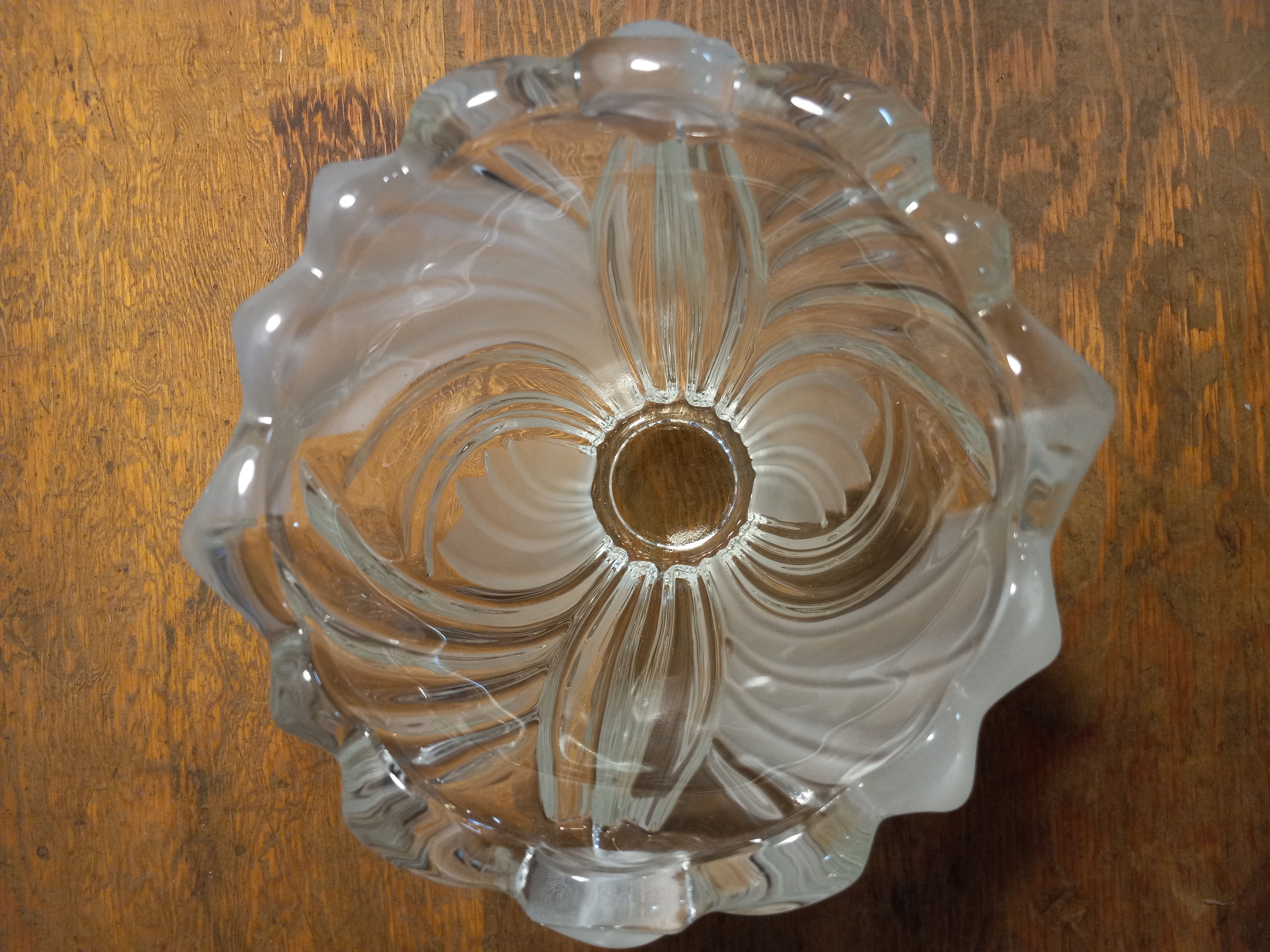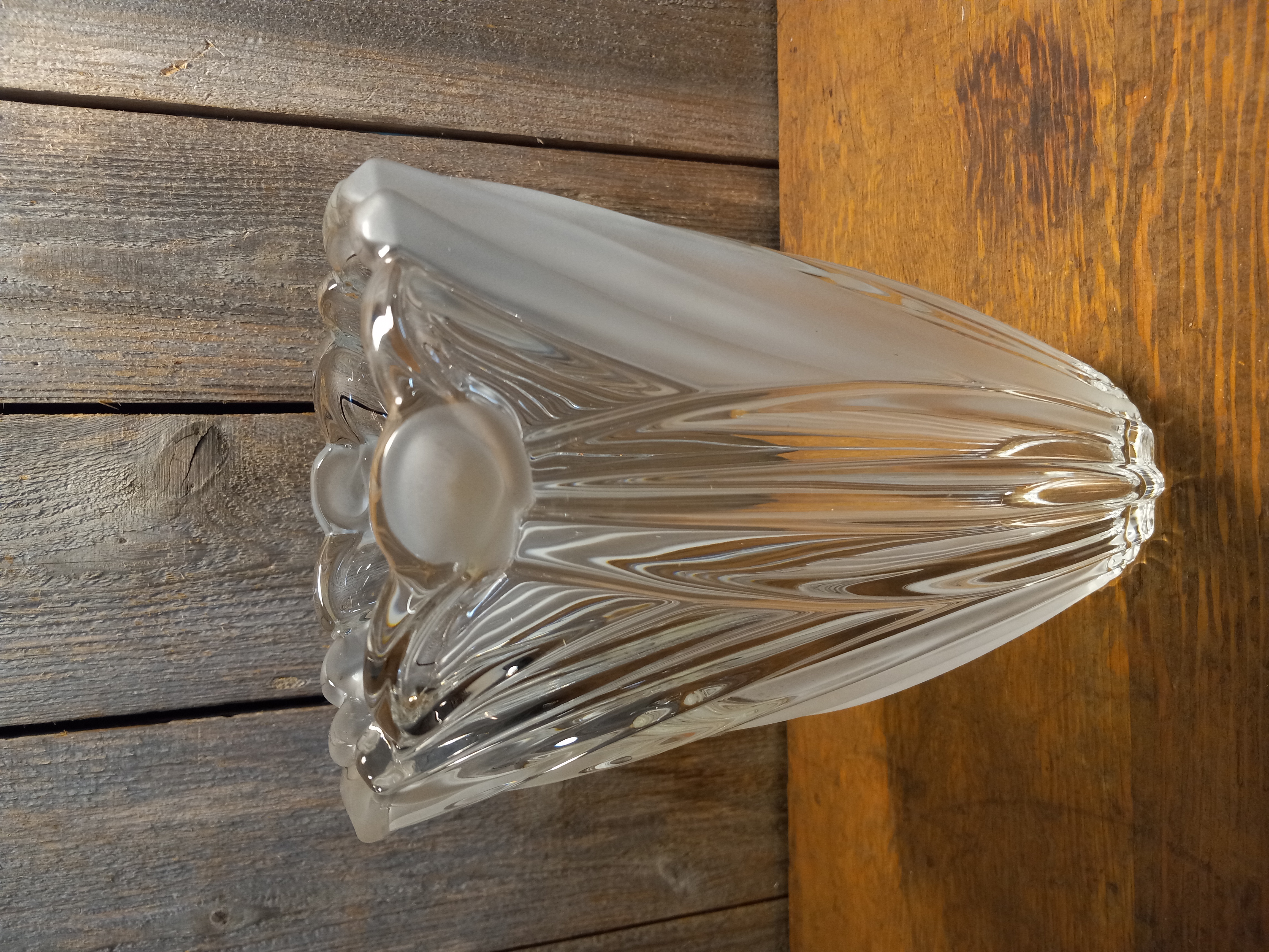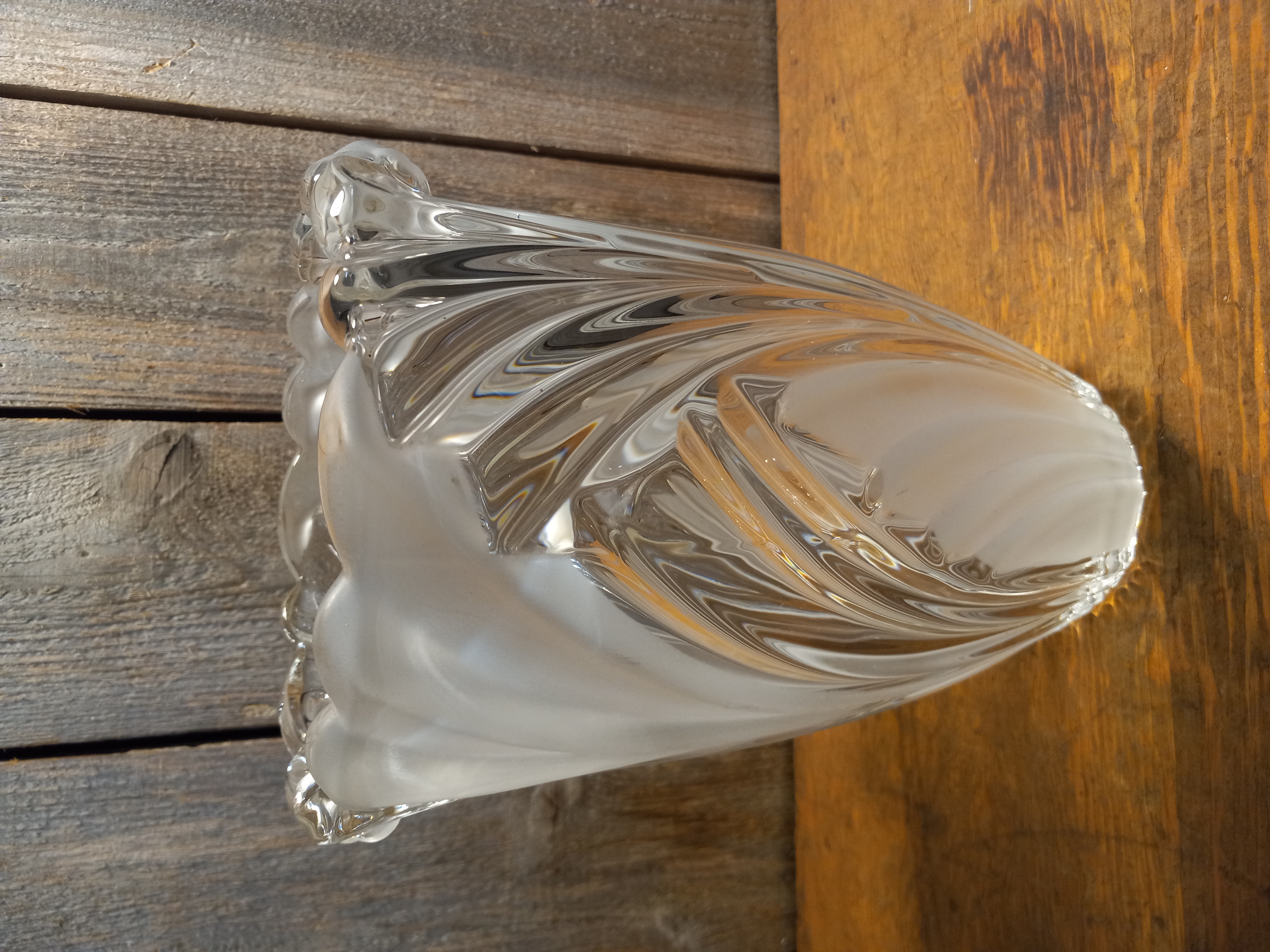 A crystal vase with a few sections that have been frosted. This vase is in near perfect condition, with only some very small signs of wear. It measures 7 x 9.5 x 7 inches.
